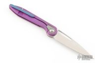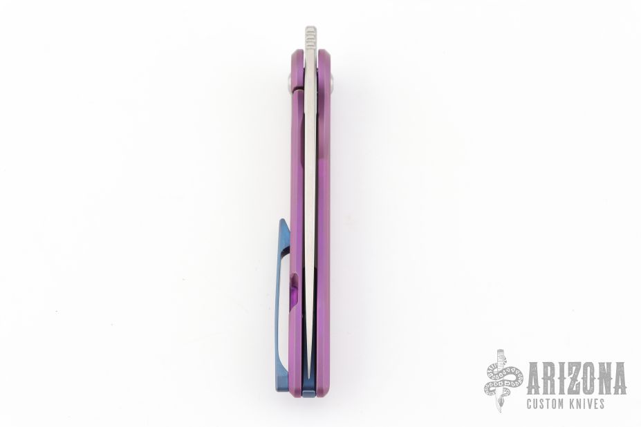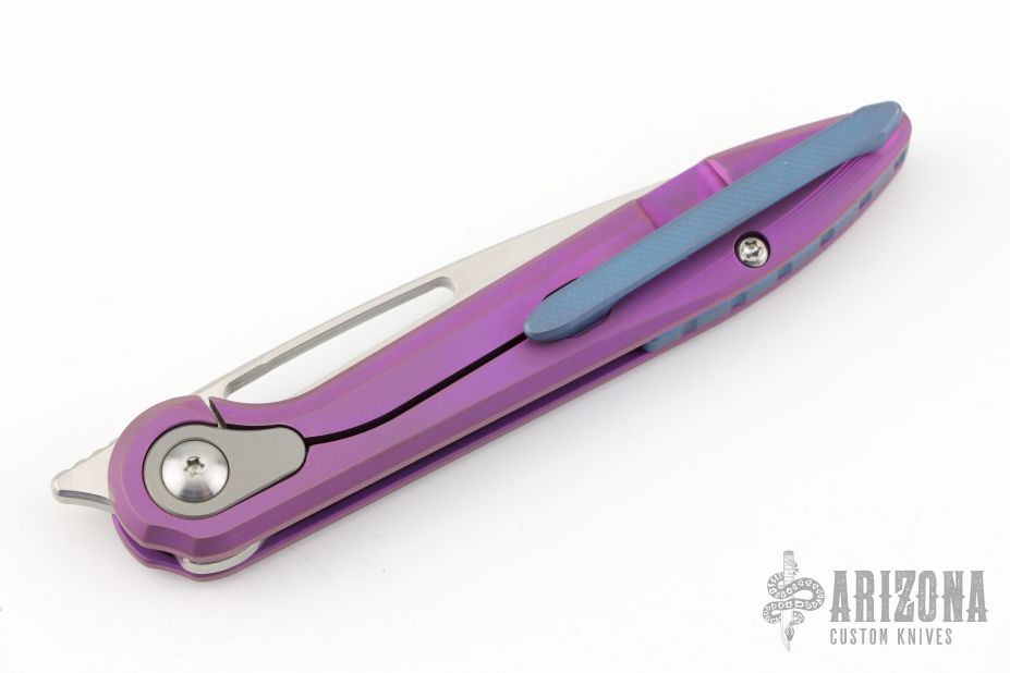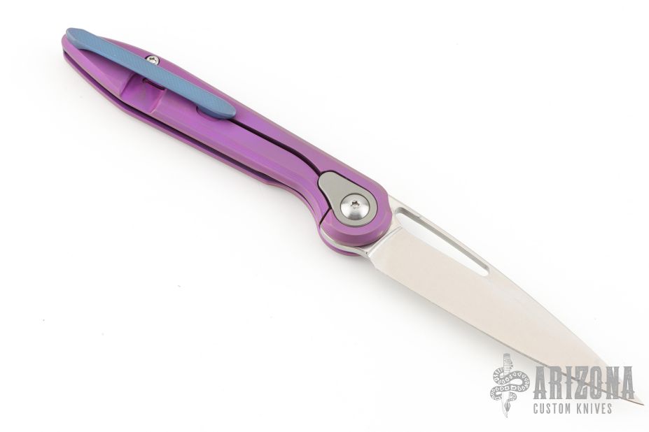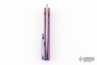 This Aero from Boos Blades features a tumble polished drop point blade with enlongated thumb hole and flipper. The handle has a blurple titanium frame with a blue titanium tip up pocket clip and backspacer. Bead blast finished titanium lockbar stabilizer. Dated 2023 inside the frame. Excellent condition.