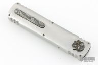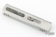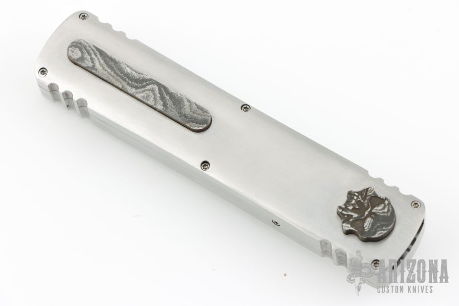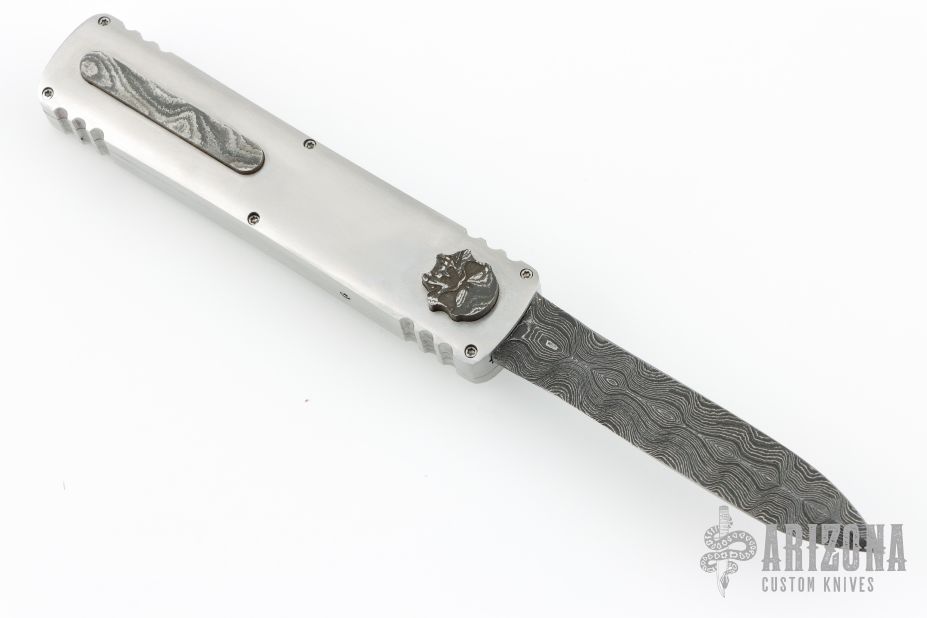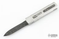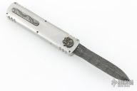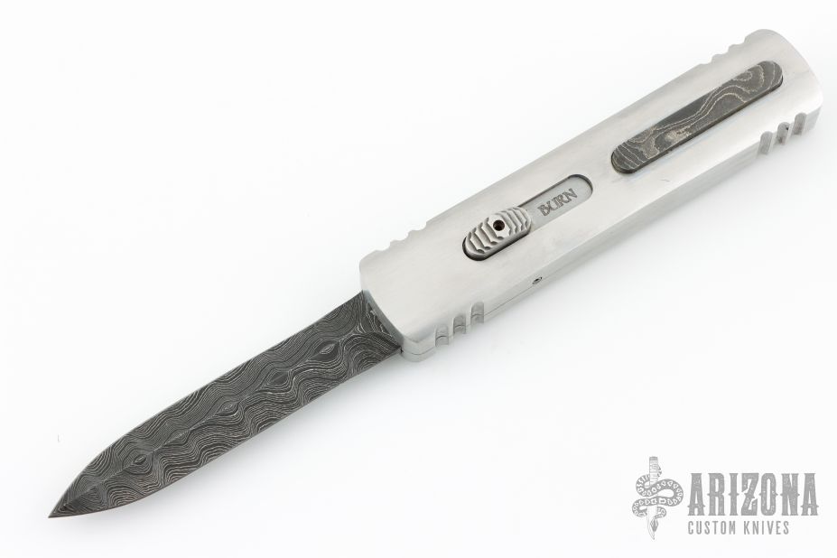 This Custom Stinger OTF by Burn Knives features a Damascus double-edged blade. The handle has a satin finished 416SS frame with a Damascus inlays and milled thumbslide. Nice action and lockup. Has a couple light scratches, otherwise excellent condition. Comes with COA dated 6-10-25, and a zippered case.