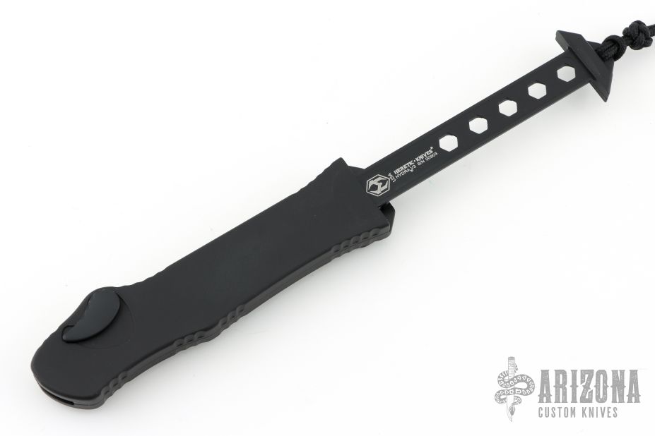 This Hydra by Heretic Knives (Anthony G. Marfione) features a black tanto fully serrated blade. The handle has a black aluminum frame, stainless clip, stainless steel and carbon fiber charging handle. Comes with original box and papers. S/N 00903. Excellent condition.