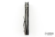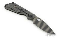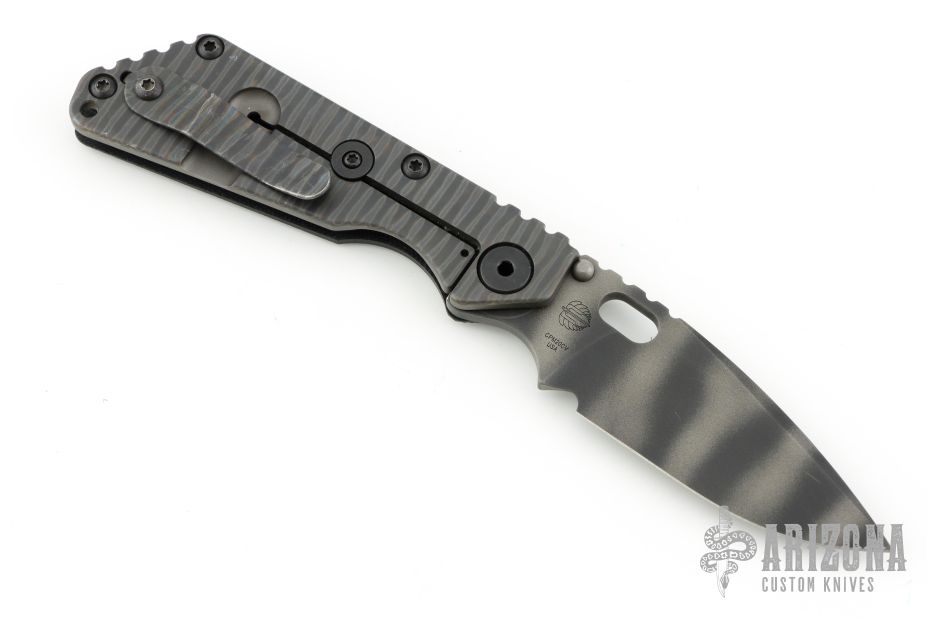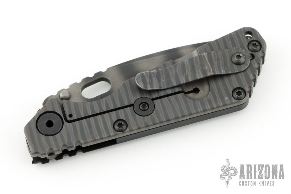 This MS SNG framelock folder by Mick Strider features a tiger striped drop point blade and a Crosshatch Black G-10 and flamed titanium frame and tip up titanium clip. Includes Hinderer "Lock Bar Stabilizer" for maximum reverse lock retention. Nice detent, lockup and blade seating. Has some scuffs and scratches, otherwise good condition.