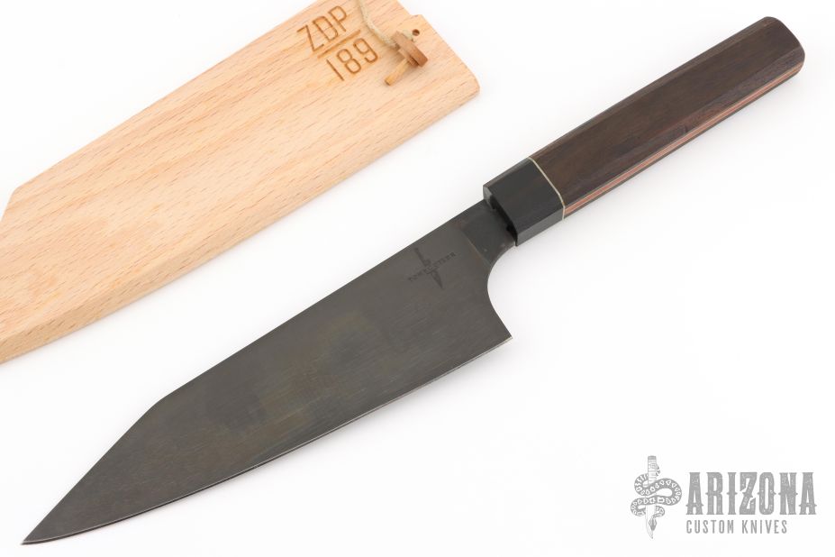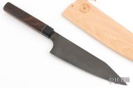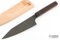This Kiritsuke by Town Cutlery features a black blade with .137" blade stock and 1.942" blade depth, hidden tang construction. The handle has an octagonal wood handle. Comes with a cloth pouch. Excellent condition. Comes with a wooden saya.