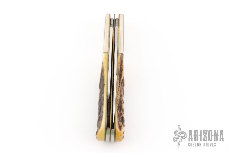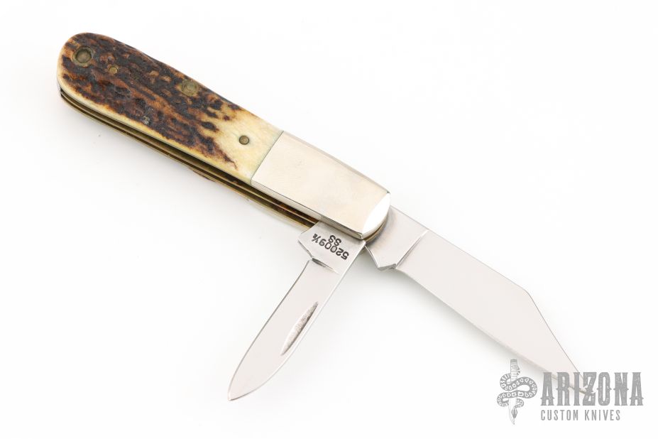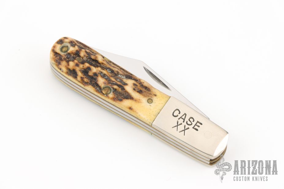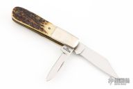 This two blade Barlow by Case features two mirror polished blades both with nail nicks. The handle has stag covers, nickel silver bolsters, brass liners and stainless steel springs. Has half-stops. Has a couple light scratches, otherwise excellent condition. Comes with original box.