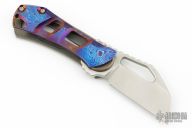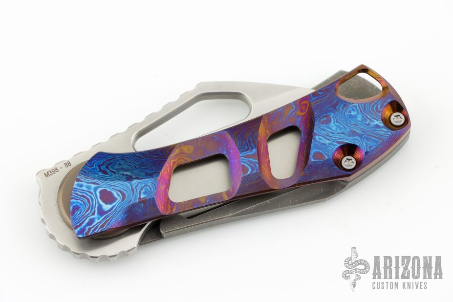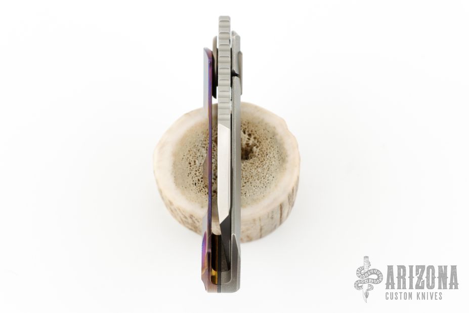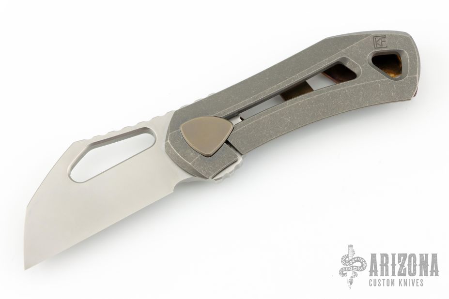 This is the OK Knife from CKF! This is a folding knife that does not have a lock. It has a M398 Chisel Ground CKF wash blade that rides on bearings. One side of the handle is tumbled titanium and the other side has a large pocket clip that acts as a scale.