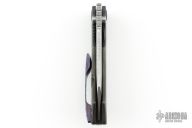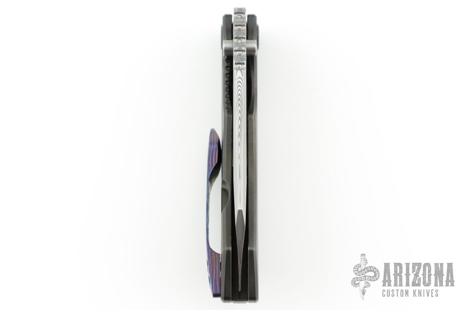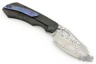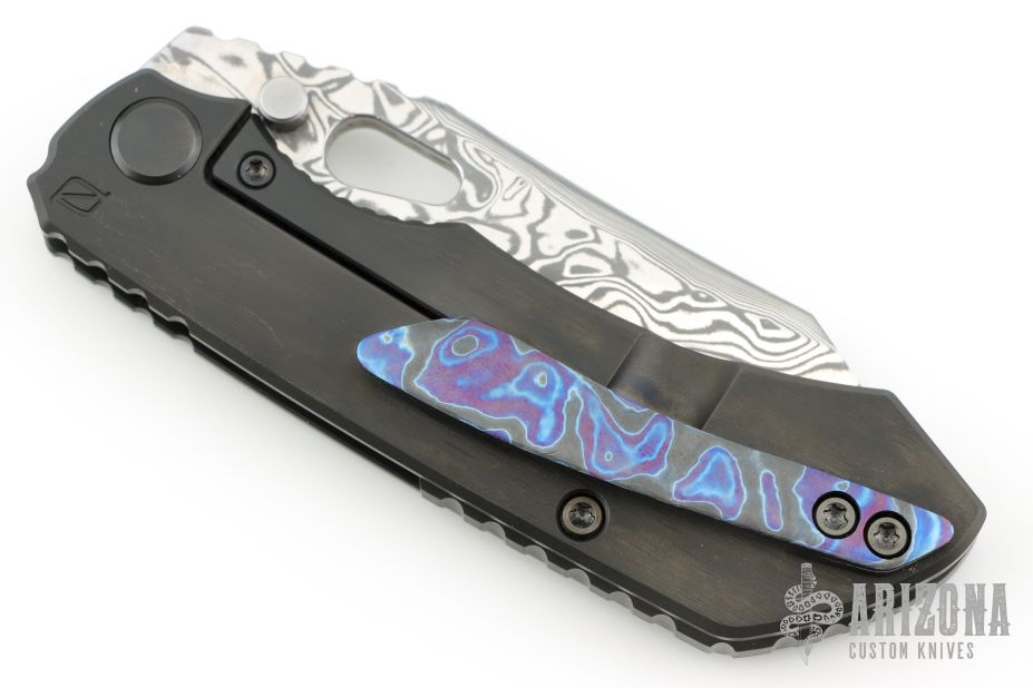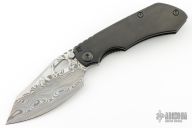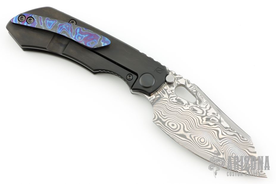 This Evolution 4.0 by Custom Knife Factory features a polished damasteel blade with notched thumbrest and thumbhole. The handle has a tumbled bark finished Zirconium frame with a notched backspacer and a ZircuTi tip-up pocket clip. Comes with maker's velcro case, extra hardware/clip, and COA. Nice detent, lockup and blade seating.  #135 and dated 2-24.  Excellent condition.