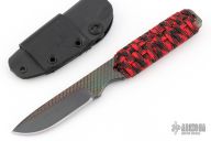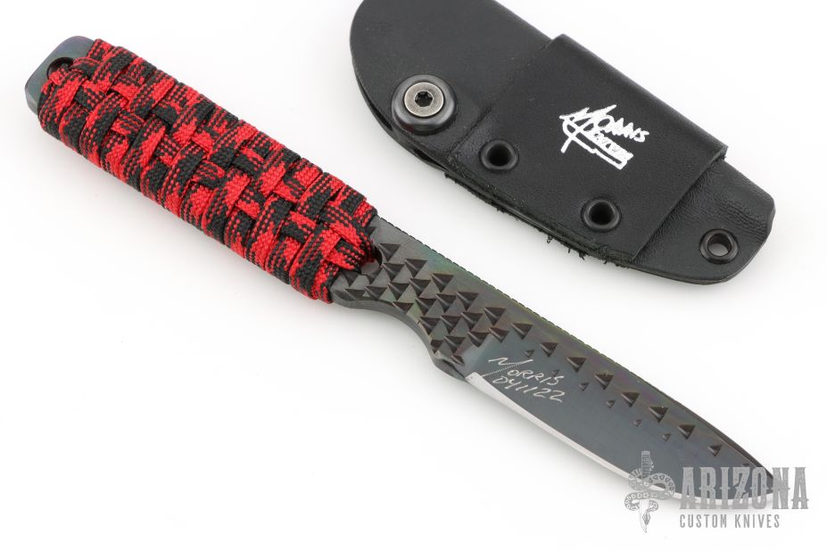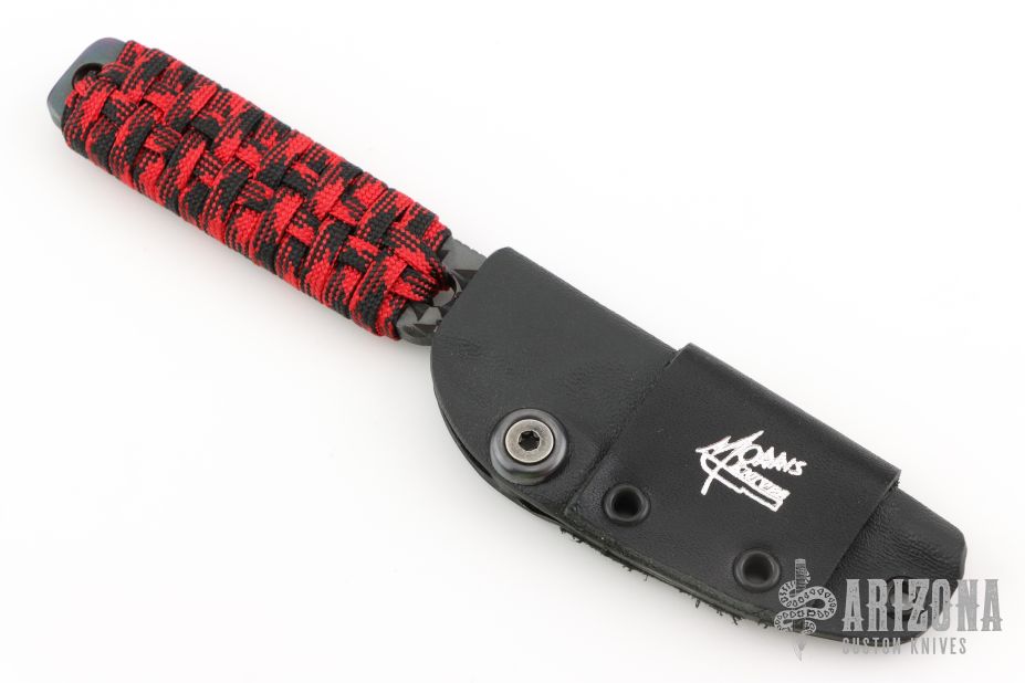 This knife by Mike Morris features a black blade ground from a file, .185" blade stock and .752" blade depth, full tang construction with cord wrapped handle. Comes with a Kydex sheath. Excellent condition.