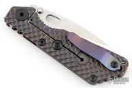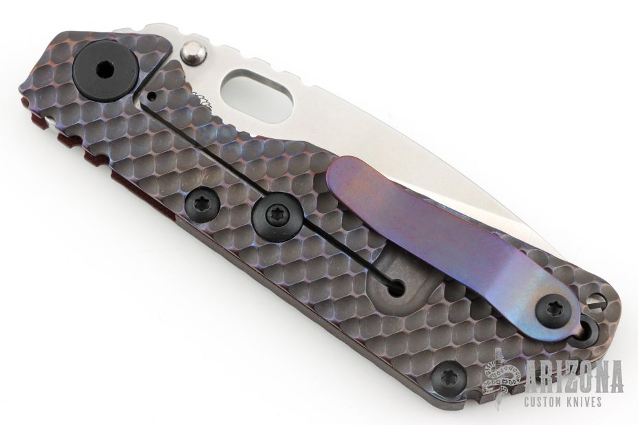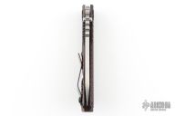 This SNG DGG by M Strider has a satin/stonewashed Bowie blade with dual thumb studs, thumbhole, and notched thumbrest. Handle is black G-10 and antiqued anodized titanium "Gunner Grip", lockbar stabilizer, and titanium tip up clip. Nice detent, lockup and blade seating. Excellent Condition.