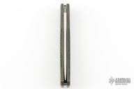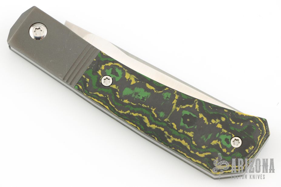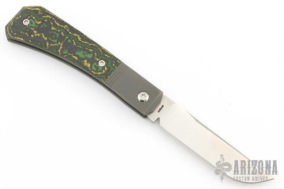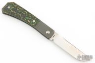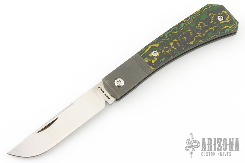 This Pioneer Jack slipjoint (Farmer's Knife) by Jack Wolf Knives features a satin finished clip point blade with nailnick. The handle has integral bead blast finish pinched, fluted, titanium bolsters with Fat Carbon covers and a stainless spring. Comes with box, metallic tube with Sean Tiffany artwork, leather slip, and cloth. Has some scuffs and scratches, great condition otherwise.