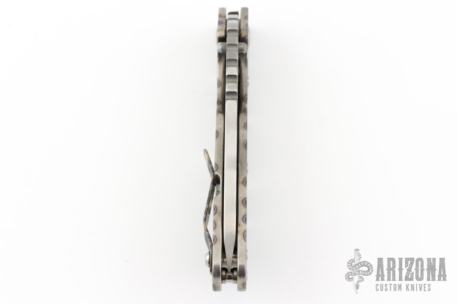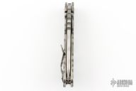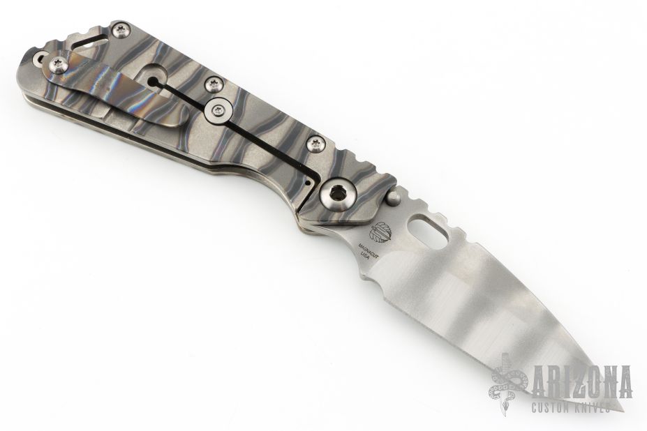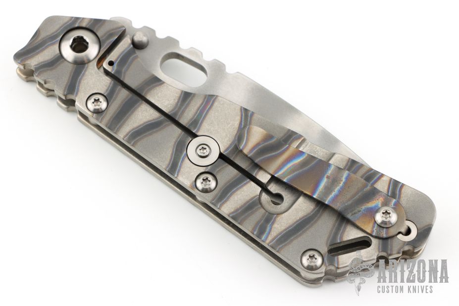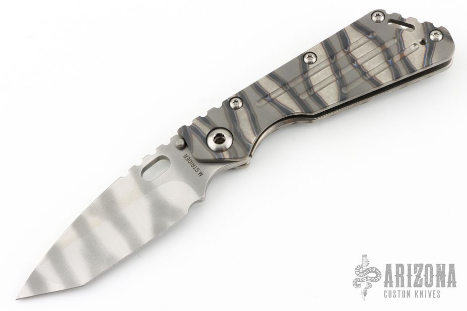 This Mick Strider Performance Series SMF framelock folder features a ghost stripe tanto blade with thumbhole and notched thumbrest. The handle has a Disruptive Strider Striped titanium frame with titanium clip, tip up carry. Jimping on blade spine. Includes Hinderer "Lock Bar Stabilizer" for maximum reverse lock retention. Nice detent, lockup and blade seating. Excellent condition.