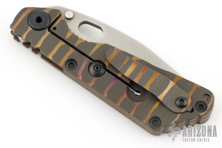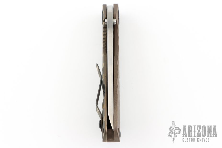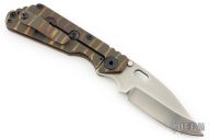 This DDC SNG by Duane Dwyer features a chisel ground blade with thumbhole, and dual thumbstuds. The handle has a caveman pattern brown G-10 and anodized titanium frame with and anodized tip up clip.  Excellent condition. Comes with Velcro case and COA dated August 2014.