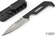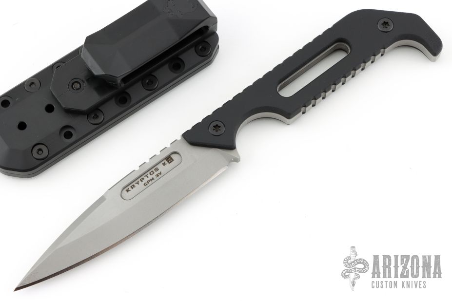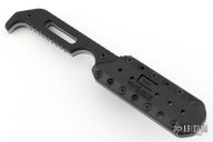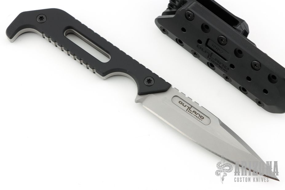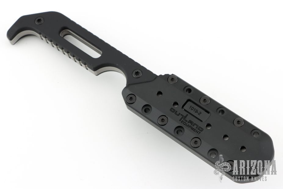 This Kryptos K2 from Outland Equipment features a gray cerakoted blade with false top edge, milled fullers and notched thumbrest, .181" blade stock and .846" blade depth. The skeletonized handle is comprised of black G10 scales over full tang construction with notches on the top and bottom and a pronounched choil for grip. Pinky hook on pommel allows for fast, sightless grip acquisition and draw. Includes custom kydex sheath with IWB clip by Blade Rigs. Comes with zippered case and tools.