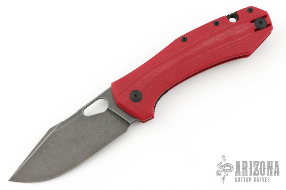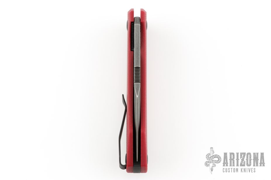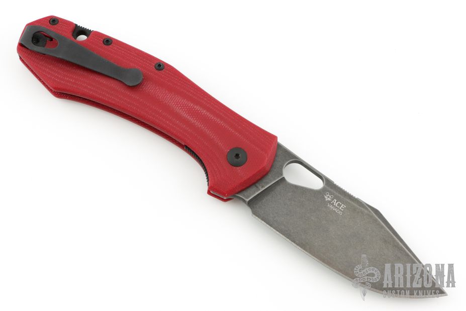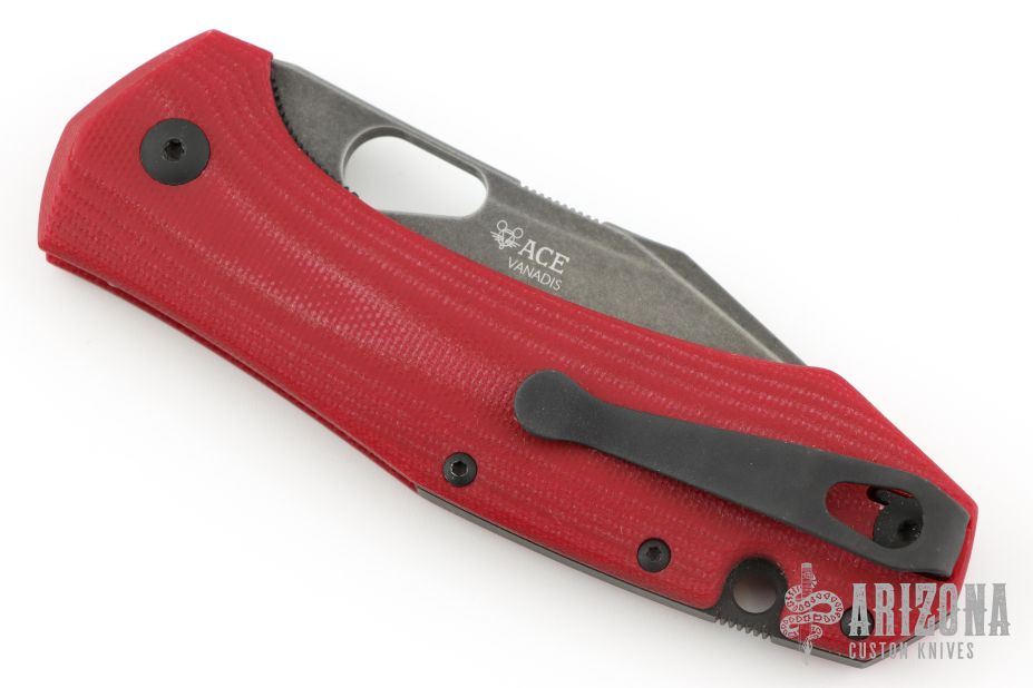 The ACE Grand is GiantMouse's EDC-friendly version of the popular GM5. With the GM5, GiantMouse set out to create what we felt would be a “magnum opus” - the ultimate GiantMouse folder to date. A cool design with an even cooler look and finish. This exclusive version featured a Red G10 Handle with nested liners and a strong liner lock. GiantMouse did keep the large stout backspacer (in titanium) for strength but added a nice deep carry wire pocket clip, for a nice comfortable carry. This exclusive also features a Vanadis 4E steel blade (Böhler-Uddeholm's version of CPM-4V) and was designed to be perfect for all-around use. A high Saber Flat Grind makes it a strong but very effective slicer, and the pronounced swedge provides a fine point for penetration without losing strength at the tip. GiantMouse states these are at a 58-60 HRC. This is at the lower end of the optimum range of Vanadis 4E, but is still more than high enough for optimal blade performance.
