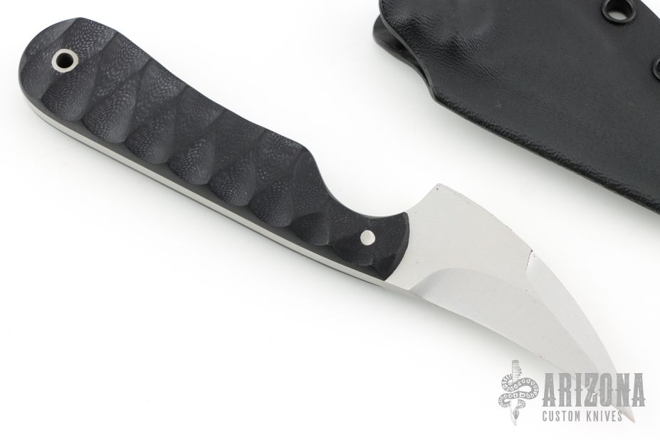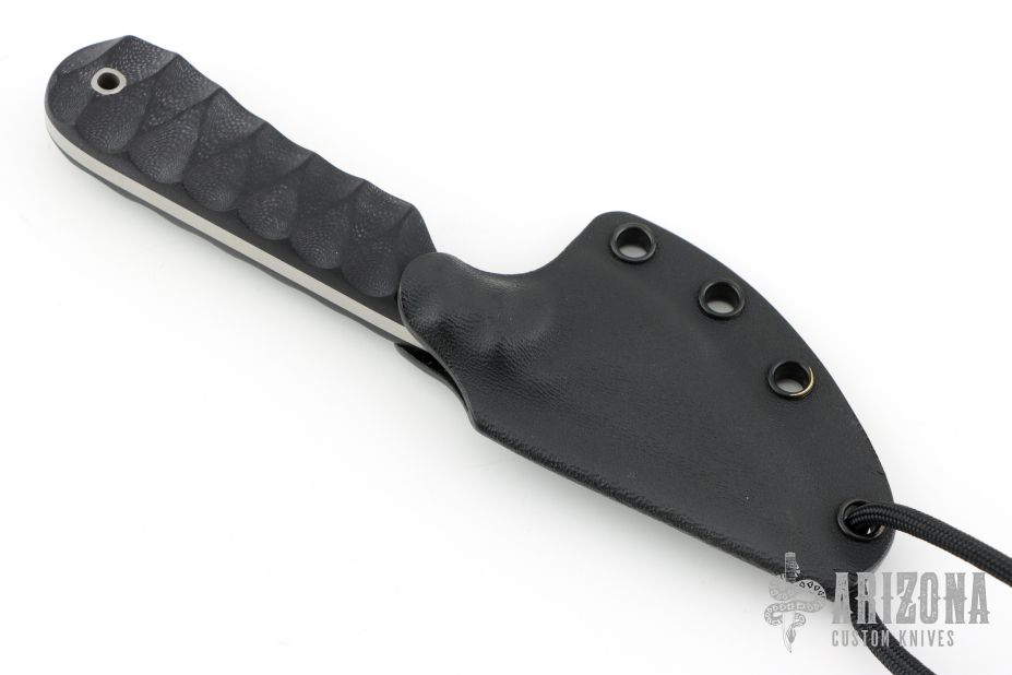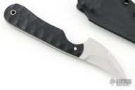 This Slimpik Mini by Xavier Knox has a bead blasted double edged blade with .163" blade stock and 1.055" blade depth, full tang construction. The handle has black G-10 scales with tube pins. Comes with a Kydex sheath and a zippered case. Excellent condition.
