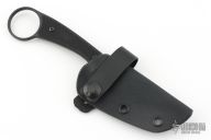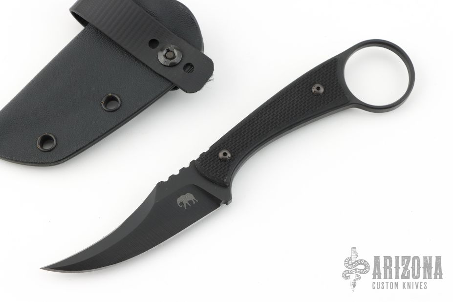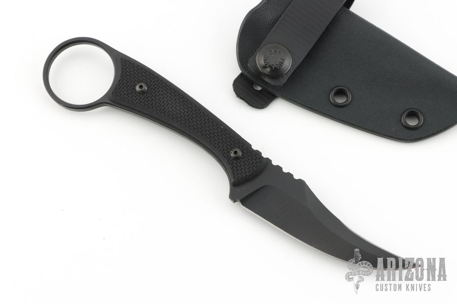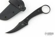 This Ring Tailed Thorn by Greg Moffatt features a black cerakoted blade with sharpened top edge and notched thumbrest, .194" blade stock and .937" blade depth, full tang construction. The handle has black g10 scales with a ring. Comes with a kydex sheath and a zippered case. Excellent condition.carlb