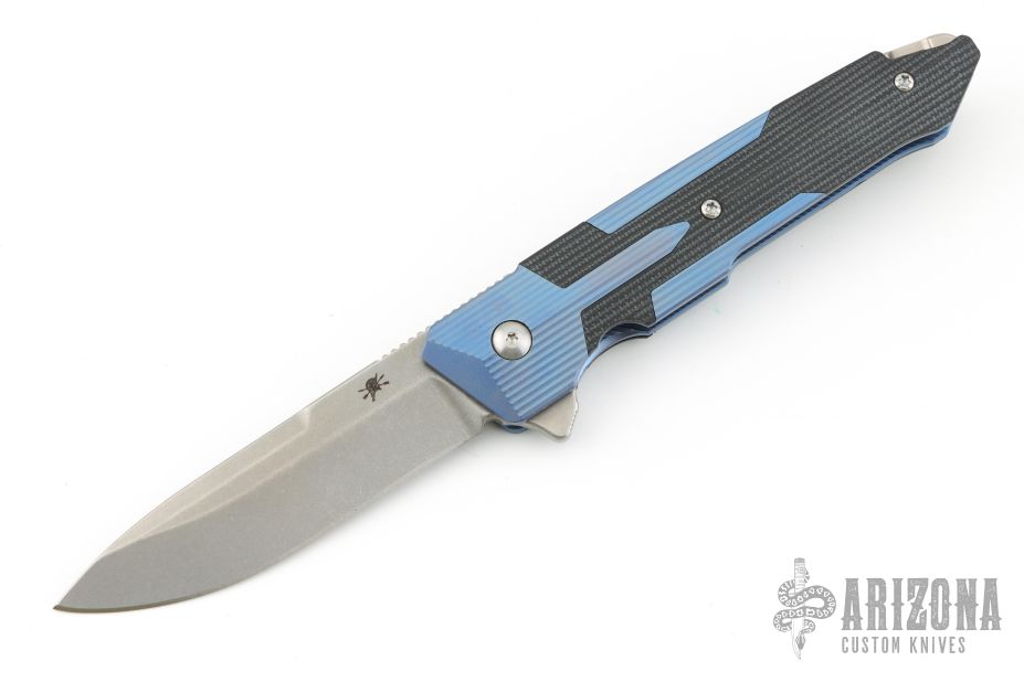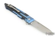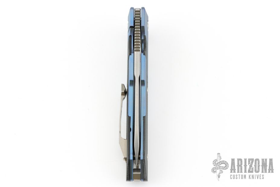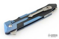The Handle: The handle is a long, ergonomic, "Kwaiken-like" profile built from solid titanium with 3D machined horizontal texture on the outside and herringbone on the inside. Both titanium slabs are inlaid with smooth, black G10 in the "Spartan Helmet" design. Lock operation is solid and smooth and over travel prevention through the clever use of the inlay. A small titanium backspacer offers a generous lanyard loop attachment.