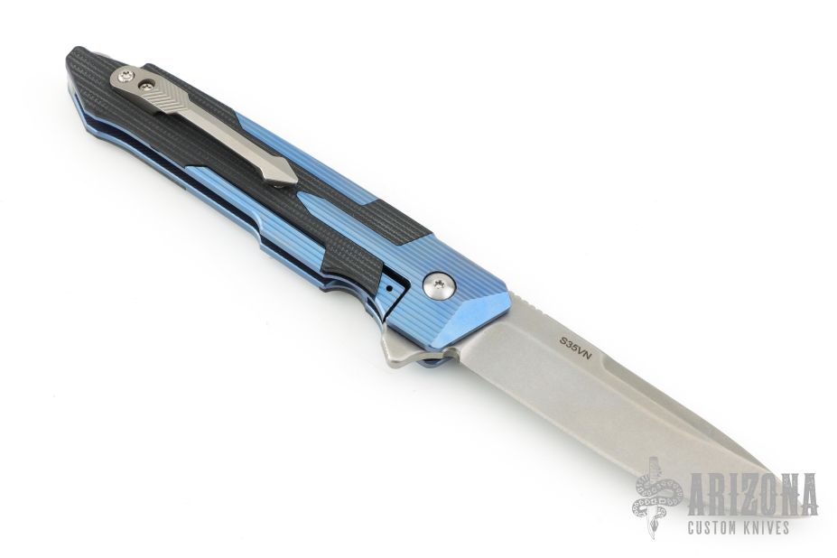 The Blade: Traditional spear point style CPM-S35VN stainless steel blade has fine heavy stonewash finish that helps to reduce reflectivity and hide wear. It's given a primary flat bevel along with a tapered top edge accent. A long stretch of jimping on the spine provides solid traction in the hand. The blade deploys on a dual ball bearings pivot system fast and smooth via the index flipper that provides a solid index finger guard in the open position.