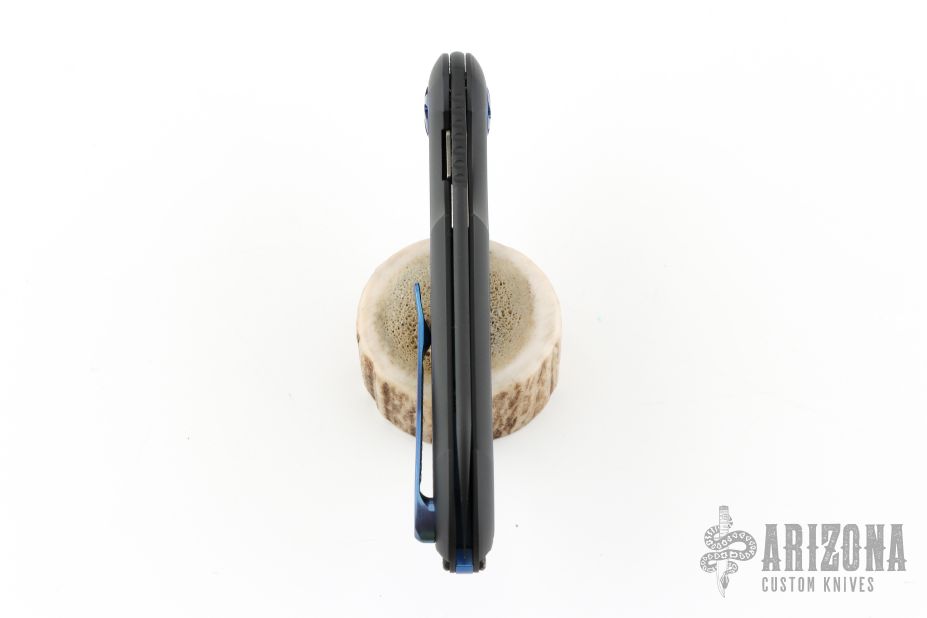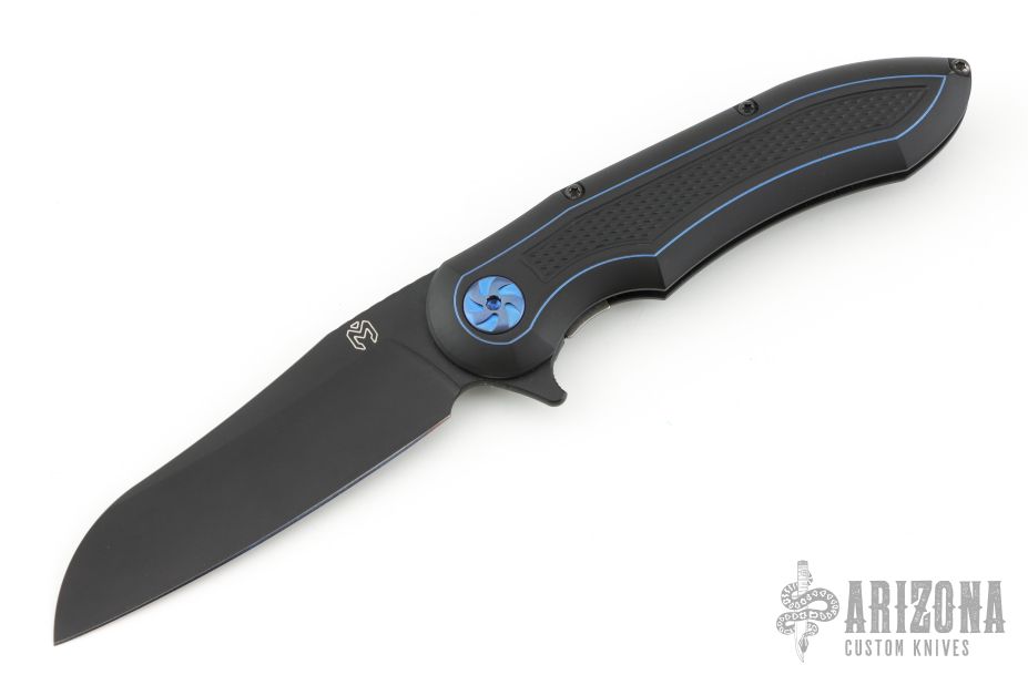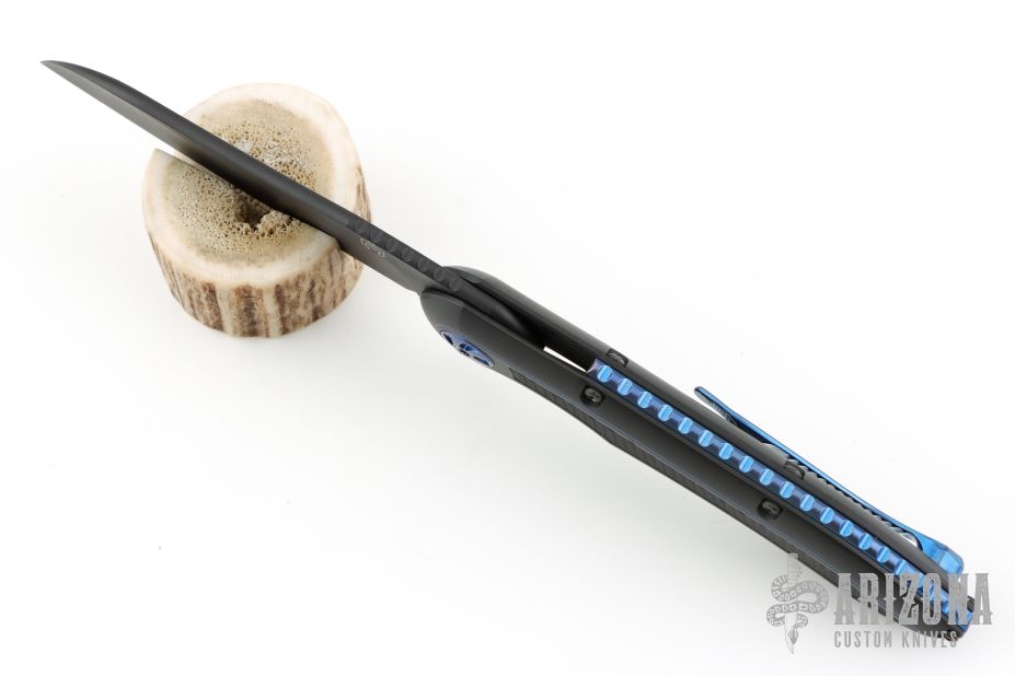 The Max Evolution by Jerry Moen features a black sheepsfoot style blade. The handle is composed of black titanium with anodized accents and matching tip up titanium pocket clip with hidden screws. The lockbar is nicely recessed into the handle scale. Excellent condition.