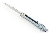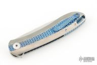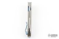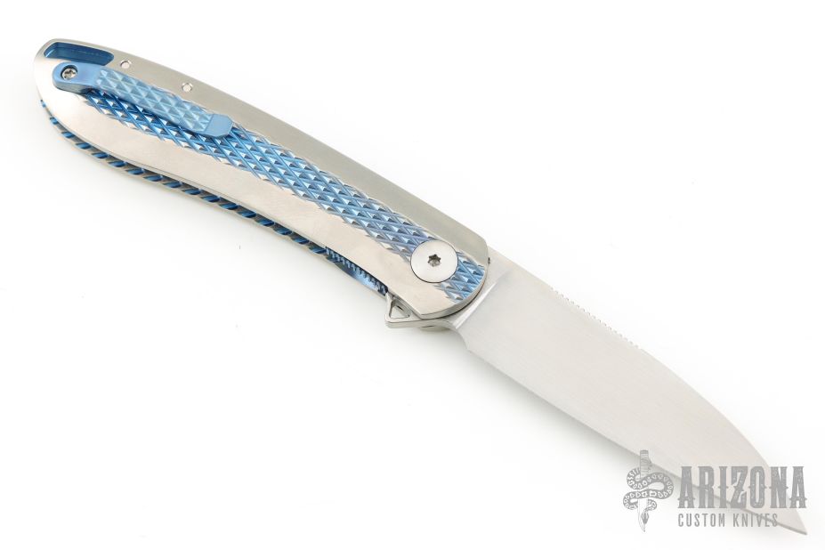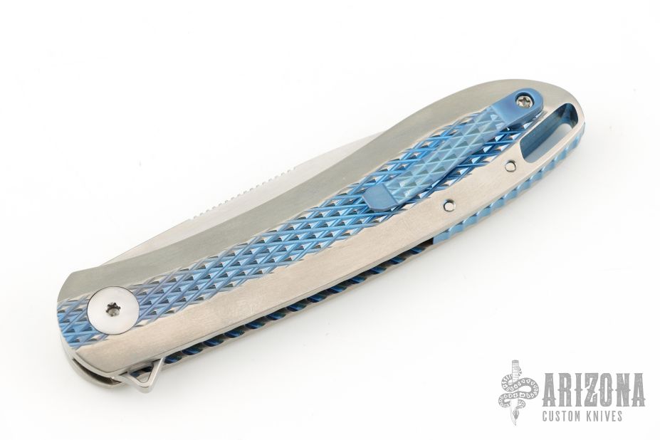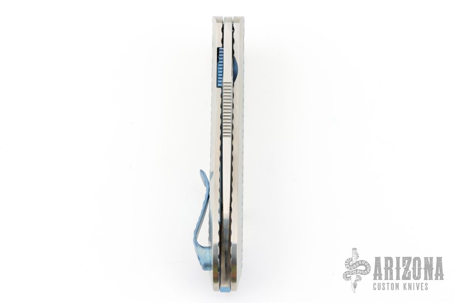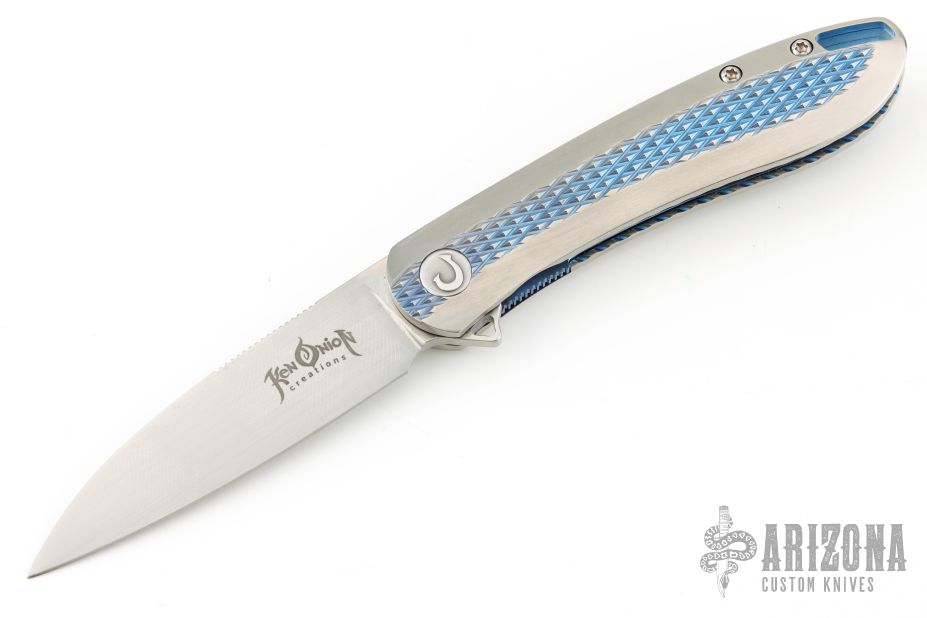 The Slacker, a liner locking flipper. Ken calls this his fully customized mid-tech as he has some parts cut but he hand fits and finishes everything himself. This knife features a hand rubbed satin finished blade of CPM 154 steel, a Titanium frame with checkering to improve grip, the checkering is also on the pocket clip, the checkered areas are anodized as is the liner lock and the decorated back spacer, inside the frame it is scalloped, there is an integral lanyard hole and the titanium pivot collar is decorated with the Onion trademark. Excellent Condition.