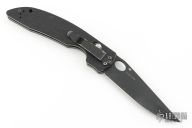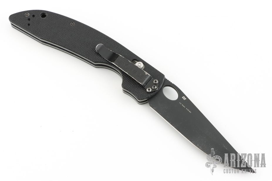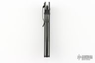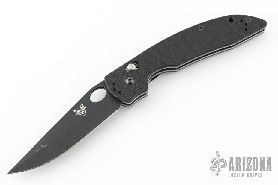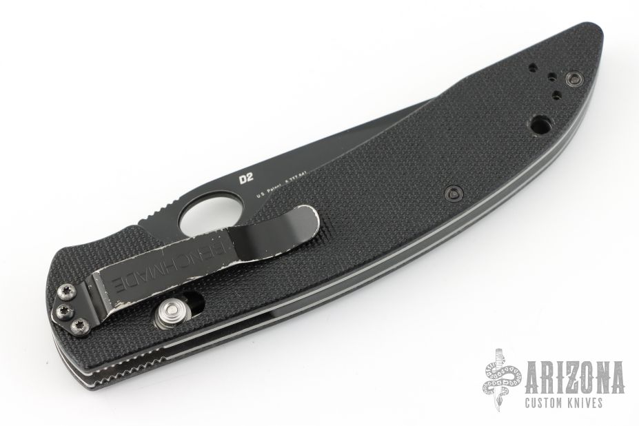 This 806D2 AFCK Axis lock folder by Benchmade has a black spear point blade with thumbhole, and notched thumbrest. The handle is black G-10 over titanium liners, black fiber back spacer, lanyard hole. 4 way adjustable pocket clip. Comes with original box, pouch, and papers. Has some scuffs and scratches, great condition otherwise.