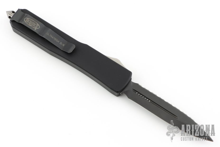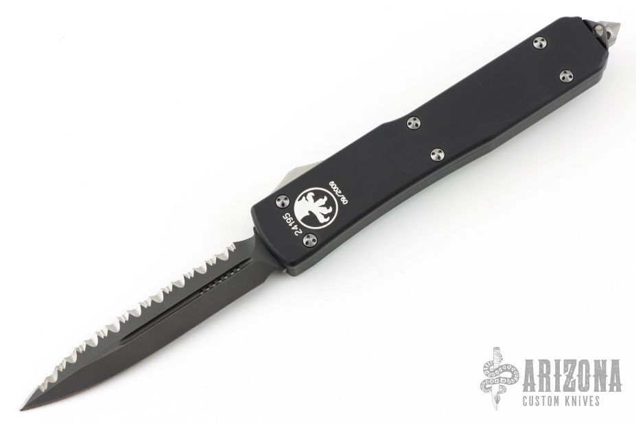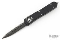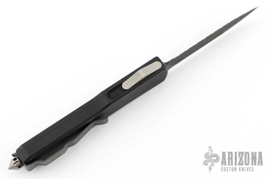 This Ultratech OTF automatic features a D/E black serrated Melonite finished blade with a black aluminum frame. Stainless steel clip, tip down carry. Glass breaker. Serial number 24195 and dated 09/2009. Comes with original box, sheath and papers. Excellent condition.