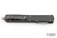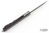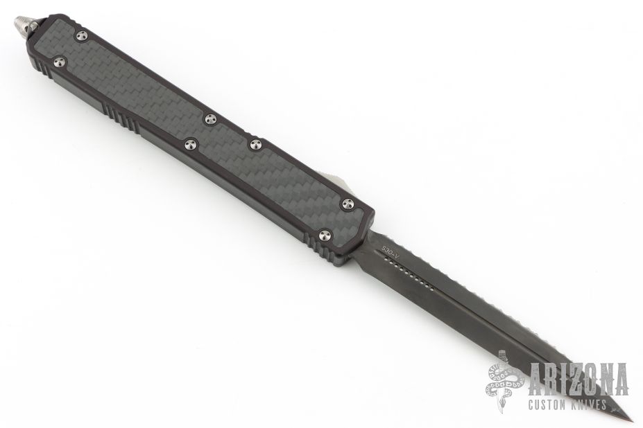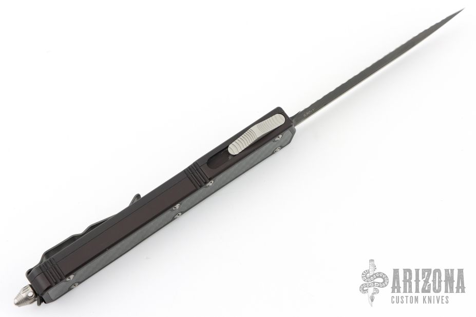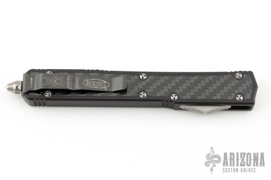 This Makora II OTF automatic by Microtech features a black double edge blade with one fully serrated edge. The handle has carbon fiber inserts on both sides of the black aluminum handle. Black coated stainless steel clip, blasted hardware and glass breaker. Dated 08/2009 and serial number 00049. Includes original box, sheath and papers. Has a couple light scuffs and scratches, excellent condition otherwise.
