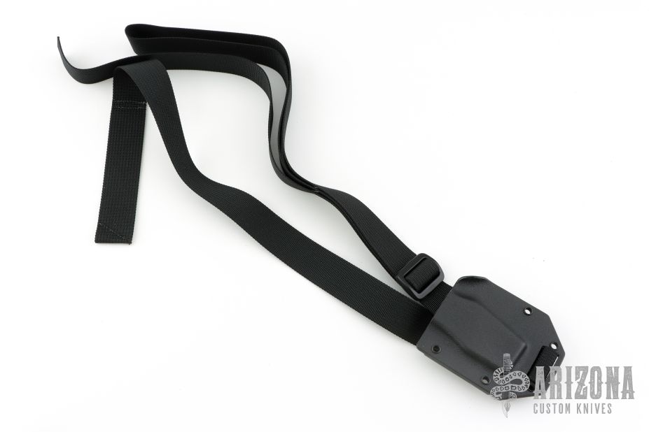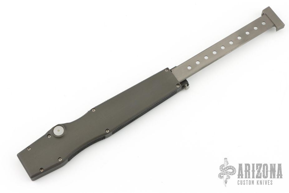 This is an original Halo (aka Halo I) dated 12/95 and features a bead blasted blade and black aluminum frame. Closes by retracting the charging handle. Non-slip overlays on sides of frame. S/N #AP018. Comes with a plain/unlabeled white box, original papers and Kydex sheath on nylon strap. Has a some light scuffs and scratches, otherwise great condition for its age and otherwise.