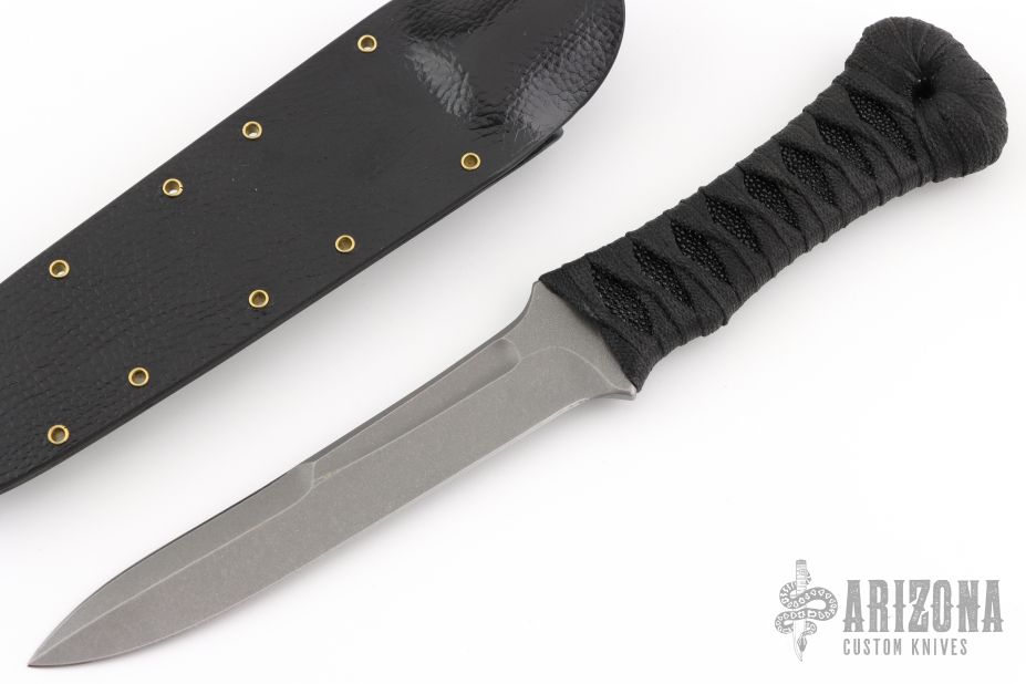 This Yari Tanto Size 1 Prototype by Joe Watson features a stonewashed blade with fullers, sharpened top edge, .150" blade stock and .922" blade depth, hidden tang construction. The handle has black cord wrap over stingray skin. Comes with a Kydex sheath, the knife can go in either direction. Comes with COA dated 11-24. New from maker!