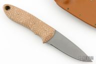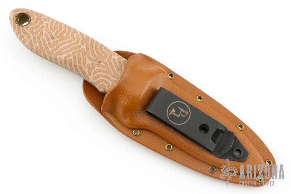 This OT Prototype by Joe Watson features a dark stonewashed blade with a false top edge, .100" blade stock and 1.167" blade depth, full tang construction. The handle has Maze-Carta scales and brass pins and lanyard hole. Comes with a kydex sheath and COA. The knife can go in the sheath either direction. New from maker! Comes with a zippered case.