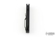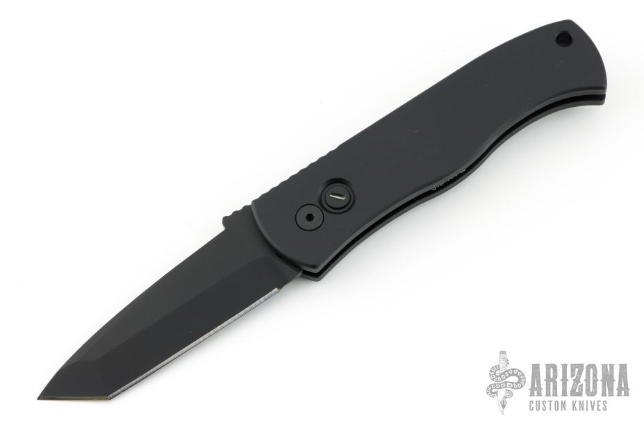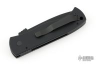 This Emerson/Pro-Tech CQC7 automatic has a chisel ground black sterile blade with a plain edge and a solid black aluminum handle with a tritium push button insert.  Black stainless steel clip. Coil spring. Comes with original box and papers. Excellent condition.