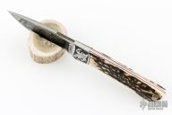 This Hunter by Ray Covers features a hand rub satin finished drop point blade with etching, a notched thumbrest and full tapered tang construction, .132" Blade Stock and 1.01" Blade Depth. The handle has engraved dovetailed stainless steel bolsters and stag scales with red liners. Includes Randall zipper case. Blade etching done by Ray Cover Jr 1991. Has a couple light scratches, otherwise excellent condition.