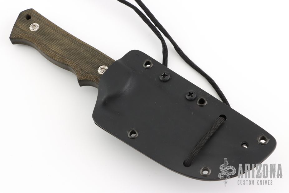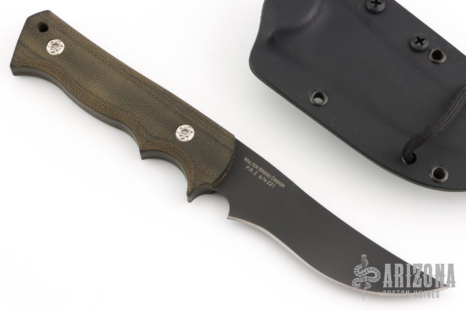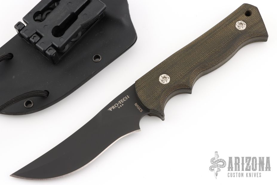 The Pro-Tech Brend Combat Companion fixed blade knife is elegant and refined. The black finished full-tang blade is premium S35VN stainless steel with a belly and upswept tip. The handle features black micarta scales that are fastened with custom screws. The handle is well-contoured with a small index choil for choking up on the blade. The accompanying sheath is kydex with a removable 1.5" capacity Tek-Lok belt clip. For those who prefer to use this as a neck knife, it comes with paracord. Comes with original box, papers and sheath. Excellent condition.