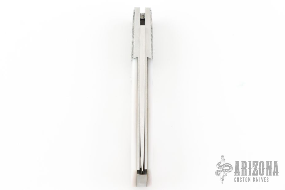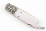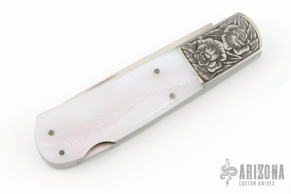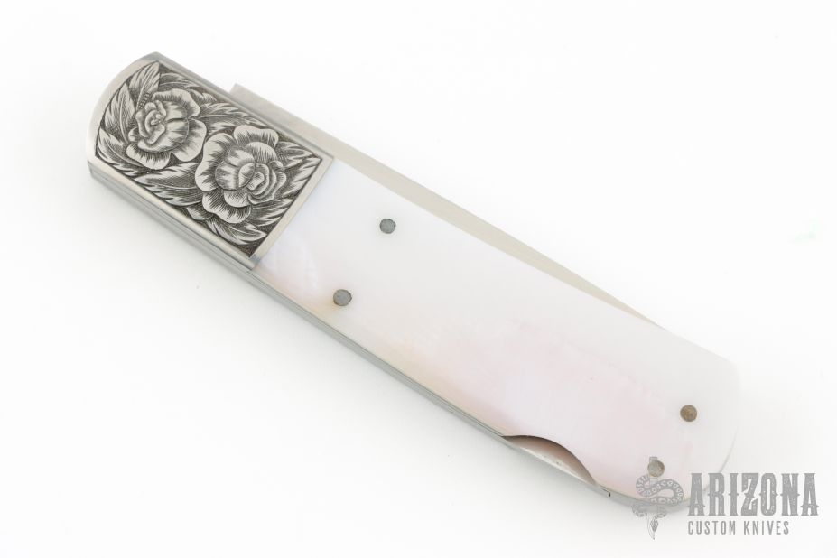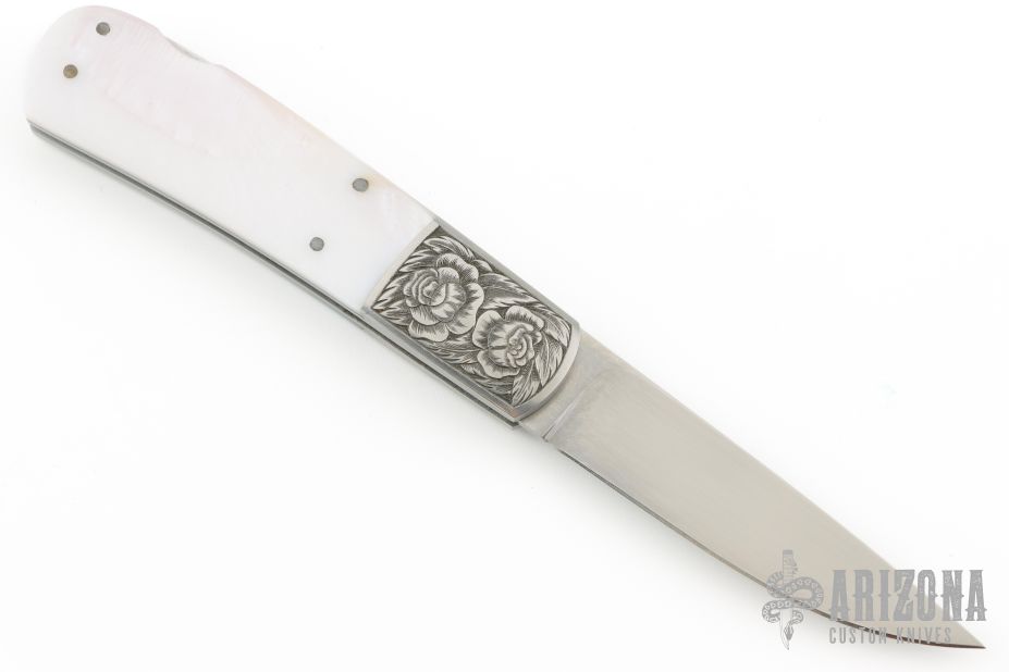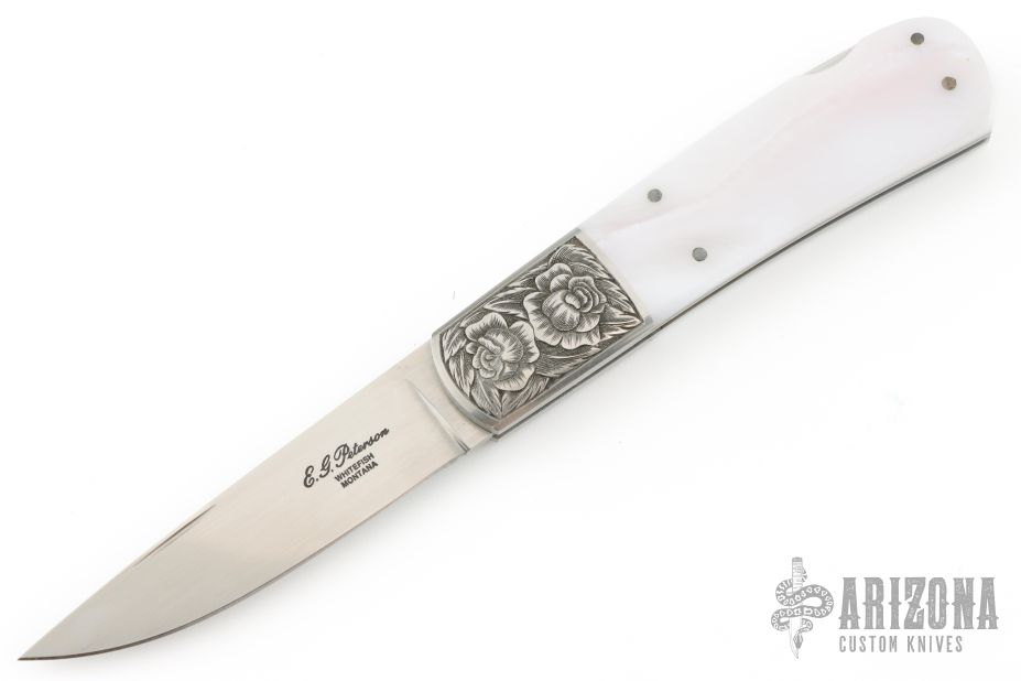 This lock back by EG Peterson features a hand rub satin finished blade with nail nick. The frame has engraved stainless dovetail bolsters liners with pearl covers, stainless spring. Nice function, strong lock up. Comes in a soft pouch. Has some light scuffs, excellent condition.