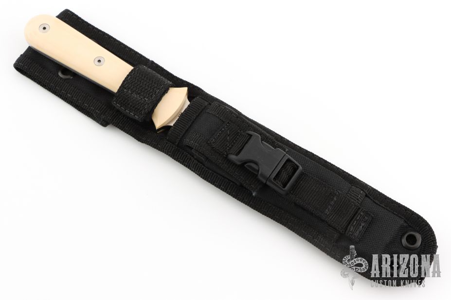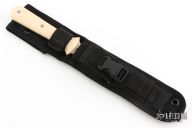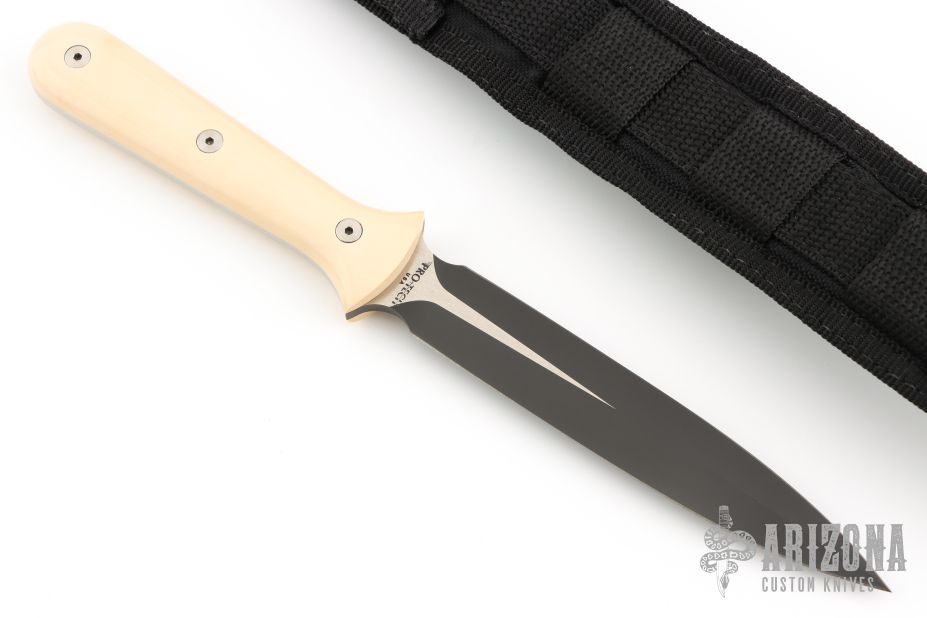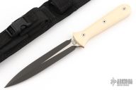 This Dagger from Pro-Tech Knives is a Walter Brend design, it features a black finished double-edged blade and a full tang construction, .173" blade stock and .950" blade depth. The handle has ivory paper micarta scales. Includes kydex lined nylon sheath with belt loop. Excellent condition. Comes with original box and papers.