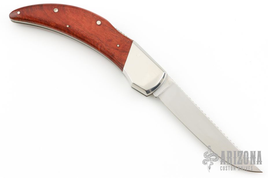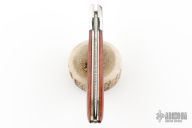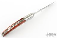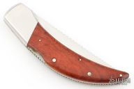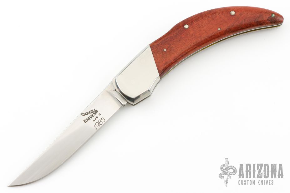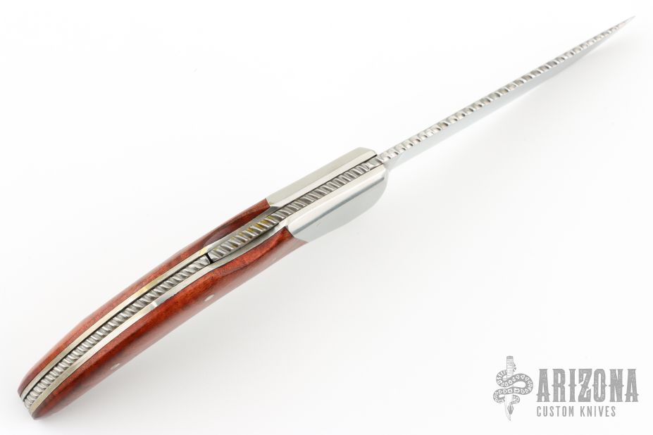 This knife by Bob Cargill features a mirror finished blade with fileworked spine. The handle has dovetail nickel silver bolsters, liners, pins, wood covers, fileworked stainless steel backspacer. Comes in a soft pouch. Has a couple light scuffs and scratches, great condition otherwise.