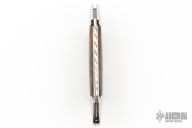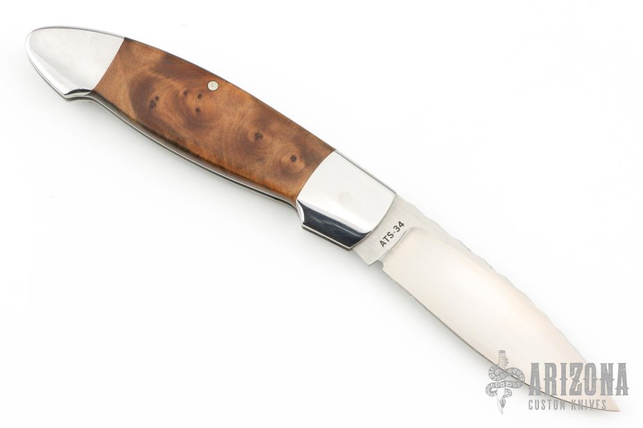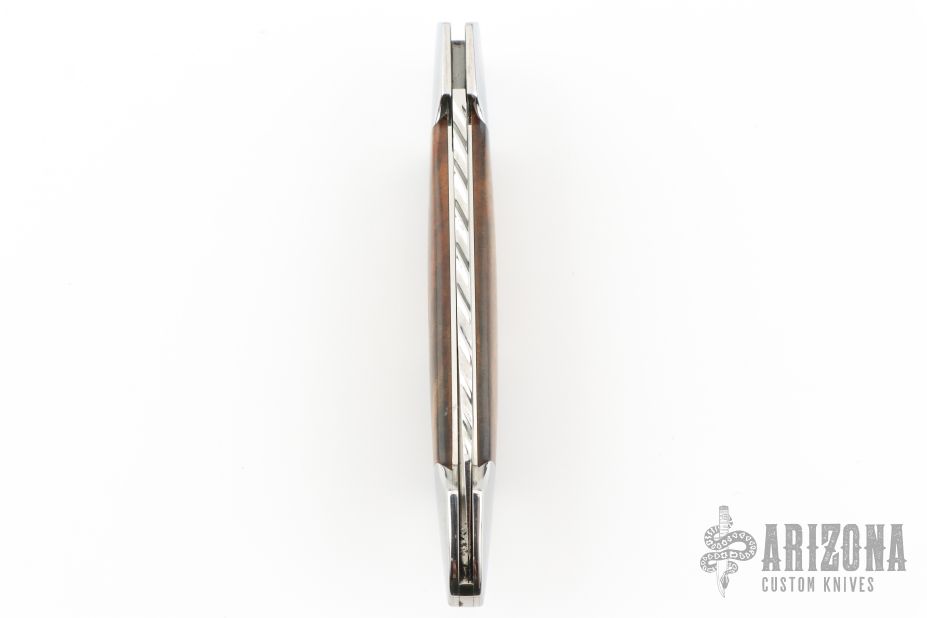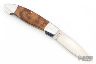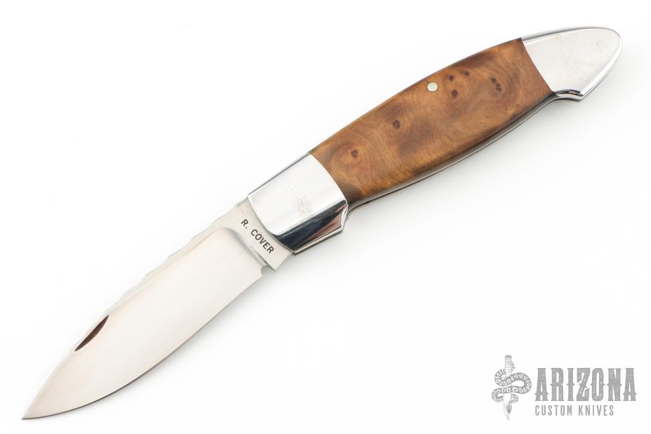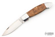 This slipjoint by Ray Cover features a hand rub satin finished blade with a nail nick and file-worked blade spine. The handle has dovetailed and polished stainless steel bolsters, wood covers, nickel silver pins, stainless steel liners and spring. Comes with a zippered case and leather pouch. Has some light scratches, excellent condition otherwise.