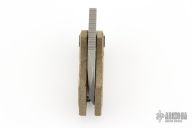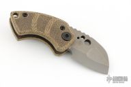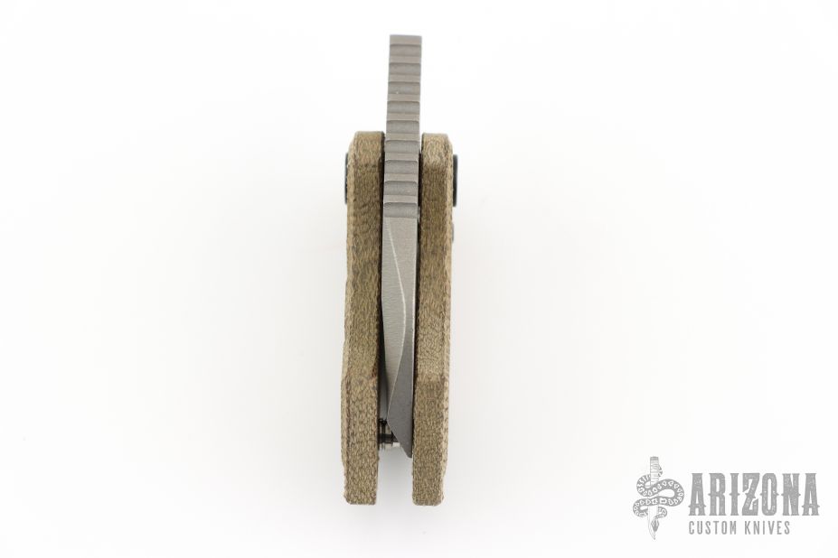 This Gnat Friction Folder by Justin Koch of Koch Tools features a tumbled blade with swedge, notched thumbrest and friction bar. The handle has a micarta frame over a titanium barrel spacer. Lanyard hole in pommel. Scratches on the blade otherwise the knife is in Excellent condition.