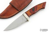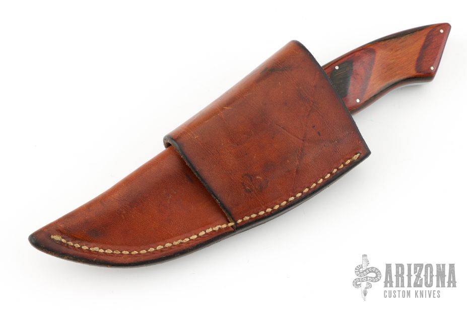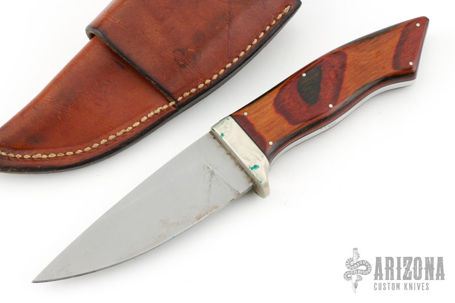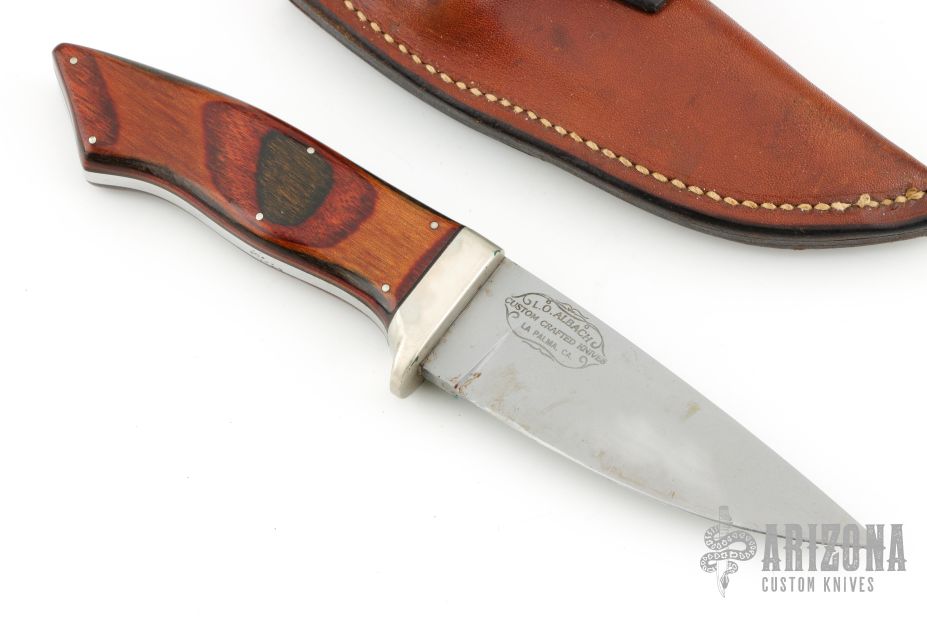 This knife by LO Albach features a bead blast finished blade with .191" blade stock and 1.206" blade depth, full tang construction. The handle has a nickel silver guard, and pinned wood covers. Comes with a brown leather sheath. Has some scuffs, scratches, and patina. Good condition otherwise.