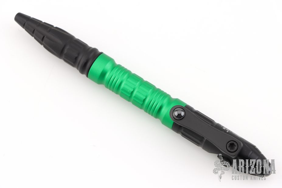 This Thoth Pen by Heretic Knives features a green aluminum barrel and black aluminum fittings. The middle piece can be removed to shorten the pen. Comes with original box. Excellent condition.
