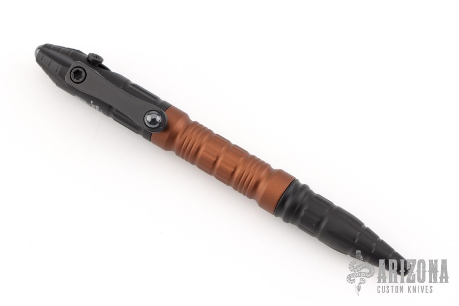 This Thoth Pen by Heretic Knives features a brown aluminum barrel and black aluminum fittings. The middle piece can be removed to shorten the pen. Comes with original box. Excellent condition.