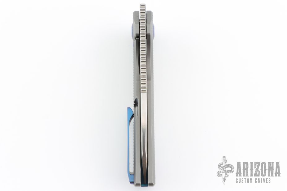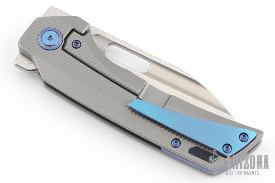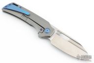 This Nymble Framelock Flipper by EMP EDC features a satin finished blade with notched thumbrest and flipper, and a thumbhole. The handle has a bead blast finished titanium frame over anodized titanium backspacer and tip up clip. Rides on bearings, nice detent, lockup and blade seating. Comes with original box and papers. Excellent condition. 045-100