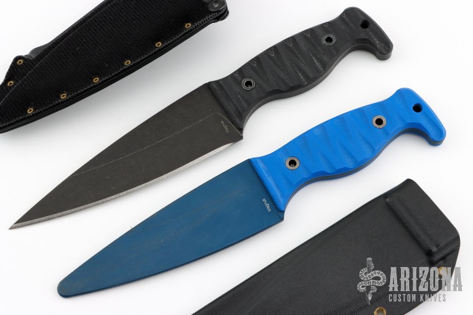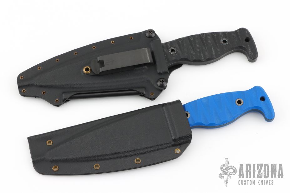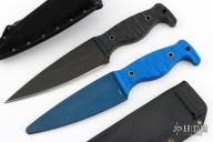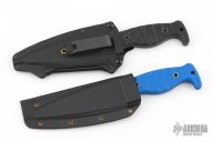 Has a black stonewashed blade with .191" blade stock and 1.461" blade depth, full tang construction with black G-10 scales. Comes with ambidextrous kydex sheath with velcro loops on one side and a metal clip on the other. The sheath also holds a fire steel in the sheath. Excellent condition. Comes with matching trainer and sheaths. #0016
