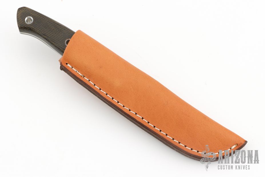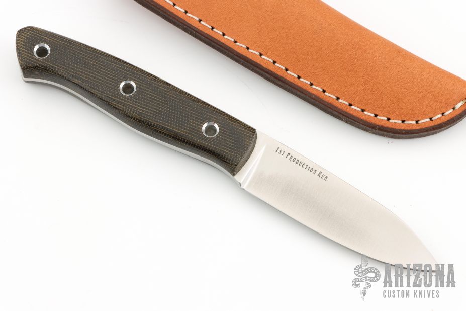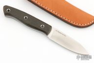 This E.L.K. "Essential Little Knife" by Bark River Knives features a satin finished hollow ground blade with .197" blade stock and .902" blade depth, full tang construction. The handle has green canvas micarta scales with hollow pins. Comes with original brown leather sheath and box. Excellent/new condition.