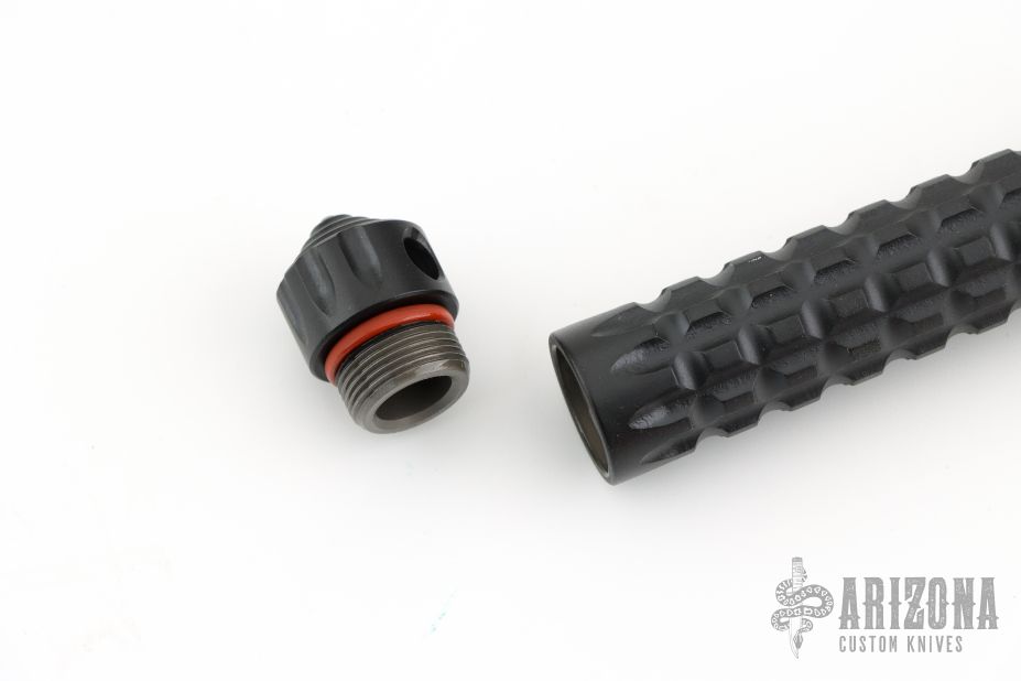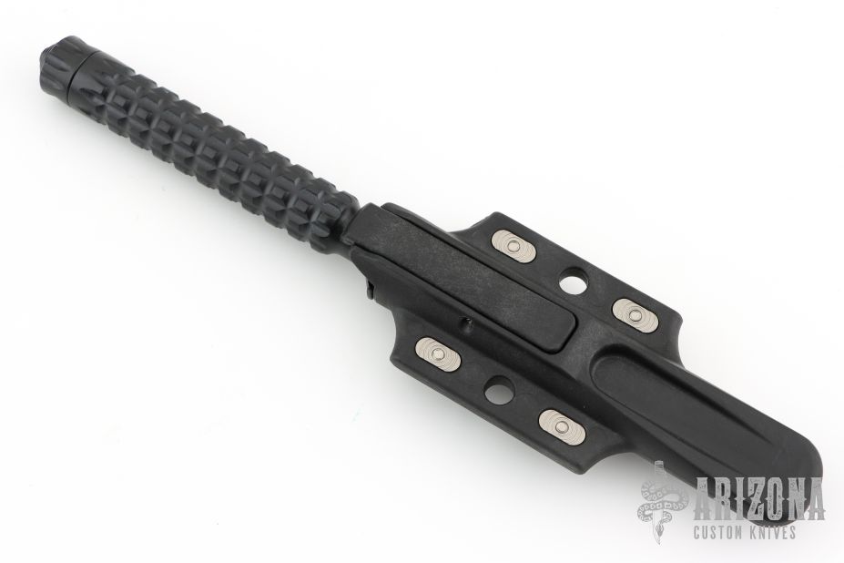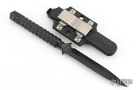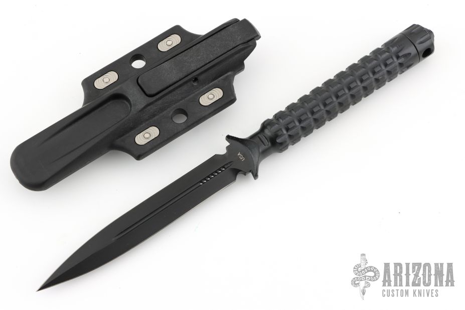 Tactical black ADO made from a single steel billet. Black double edge dagger blade with textured handle. Blade is 5/32" thick and 17/32" deep.  Removable end cap with small storage area. Sheath with belt clip. Excellent/new condition. Comes with original box and papers.