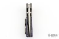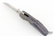 This Persecutor by Jeff Vandermeulen features a hand rub satin finished blade and flipper. The handle has tumbled titanium bolsters with a matching tip up pocket clip complimented by crazy fiber micarta scales. Includes a padded zippered case and COA. Has some light scuffs and scratches, great condition otherwise.