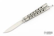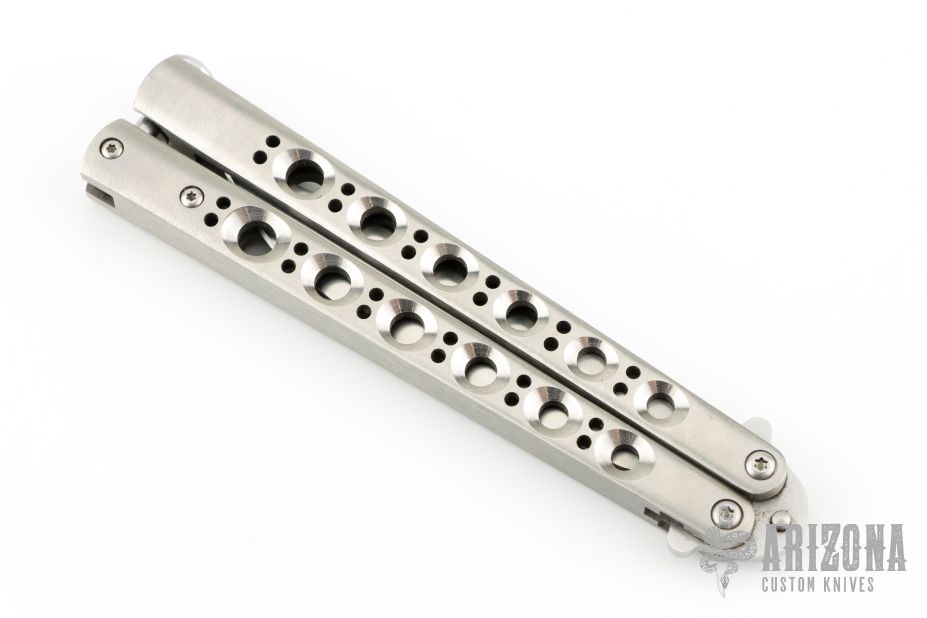 This Model 42 by Benchmade features a satin finished blade. The handles are satin finished titanium with spring-latch. Has a couple light scratches, excellent condition otherwise. Comes with original box, sheath and papers.