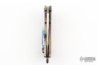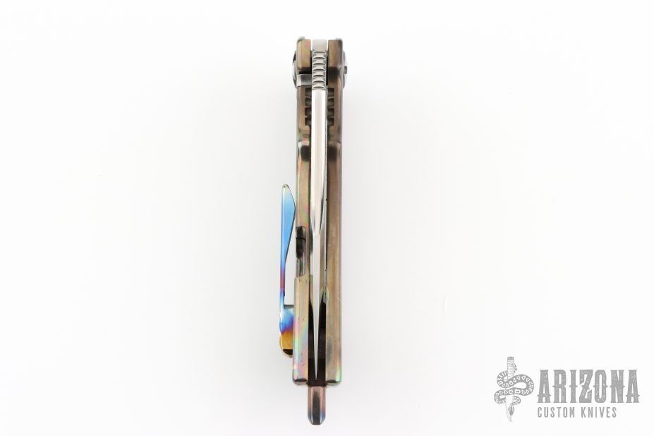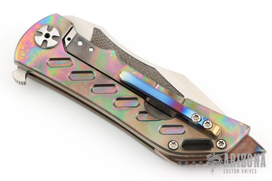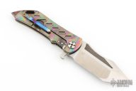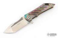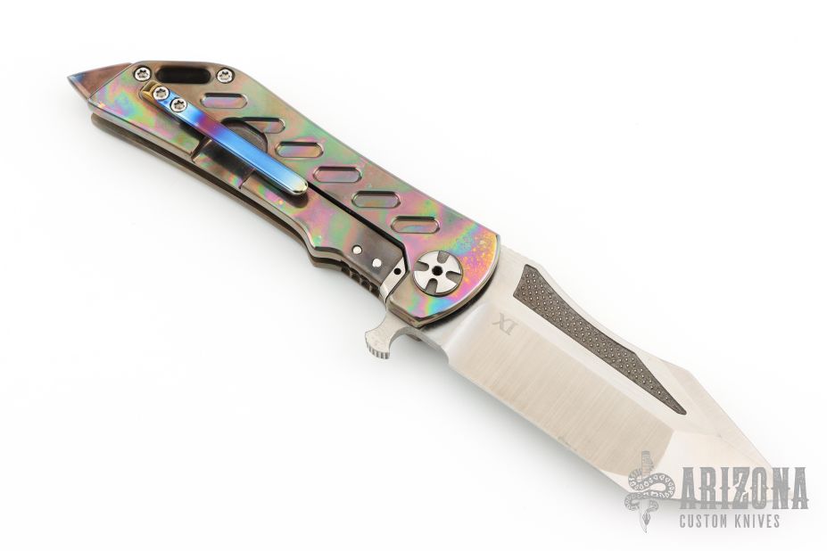This Dominator XI by Darrel Ralph features a satin finished tanto blade with swedge, notched thumbramp and flipper. The handle has an "oil slick" finished titanium frame with anodized tip up clip and titanium backspacer. Includes a padded zippered maker's case. Excellent condition.
