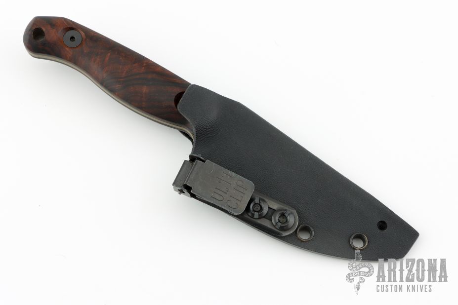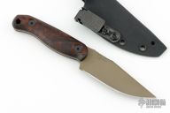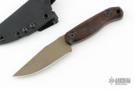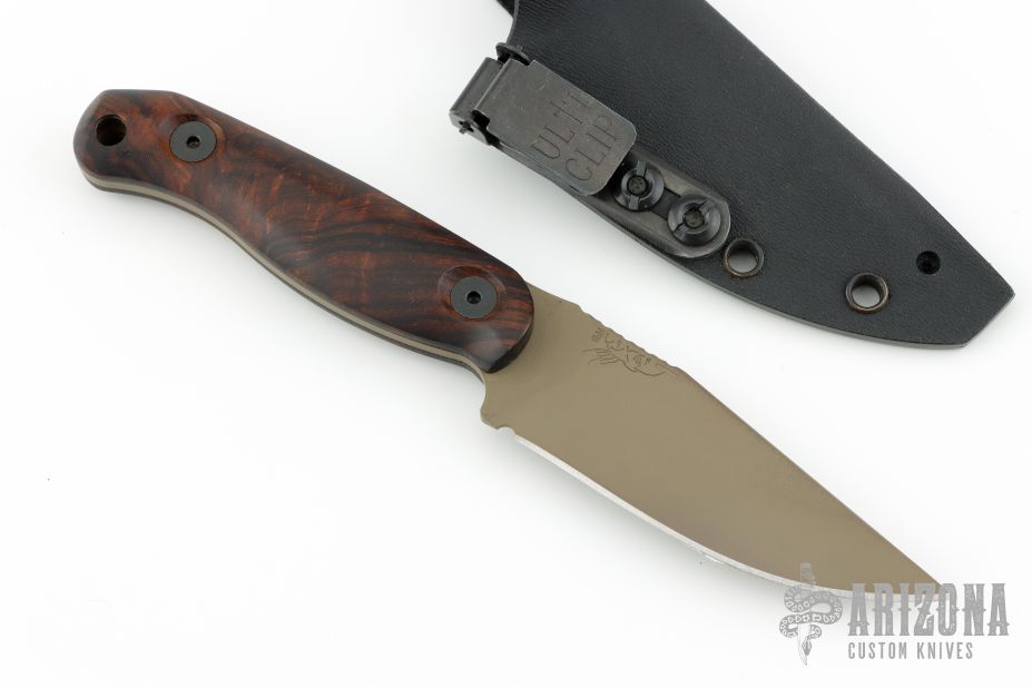 This Featherlite by Half Face Blades features an FDE coated blade with a notched thumbrest, .108" blade stock, 1.155" blade depth, full tang construction.  The handle has desert ironwood scales. Comes with a kydex sheath with clip. Excellent condition.