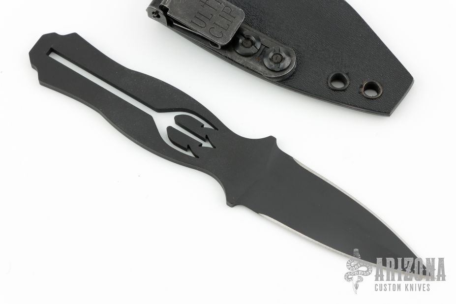 This Trident Dagger by Half Face Blades features a black double-edged blade with a full tang construction, .148" blade stock and 1" blade depth. The handle is skeletonized. Includes a kydex sheath with clip. Excellent Condition.