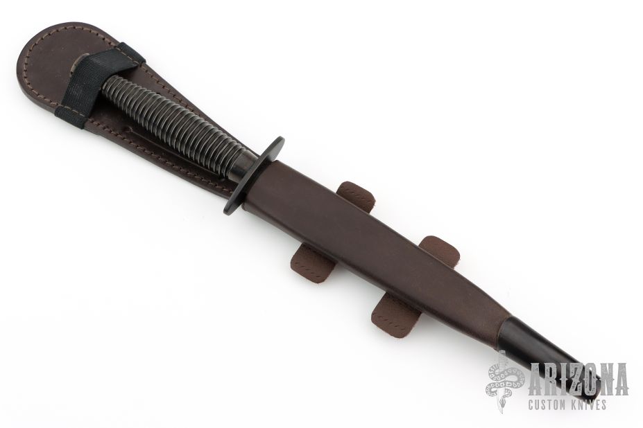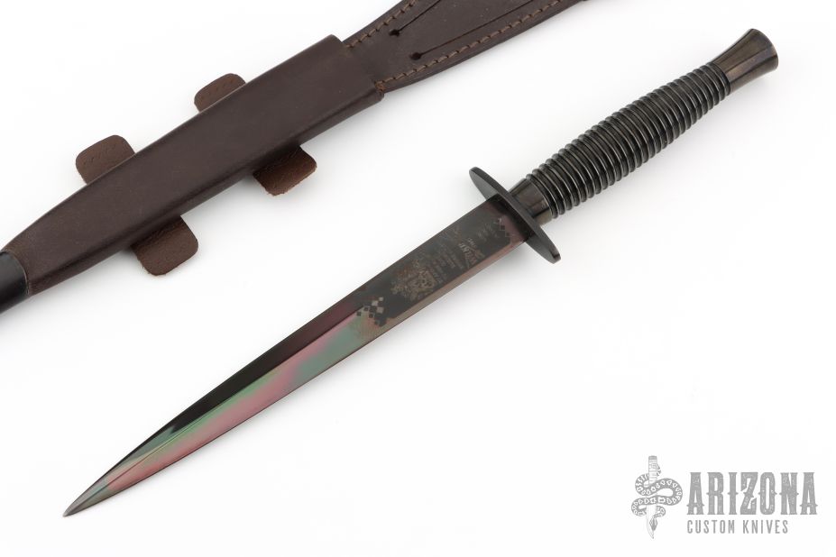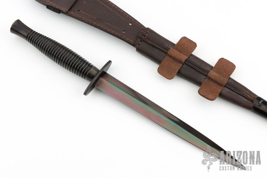 This "The F-S Fighting Knife" by Wilkinson Sword has a black blade with unsharpened edges, .217" blade stock and .852" blade depth, hidden tang construction. The handle has a steel guard and ribbed black grip with steel finial. Comes with original brown leather sheath. Excellent condition. The consignor said he bought it about 30 years ago.