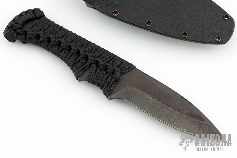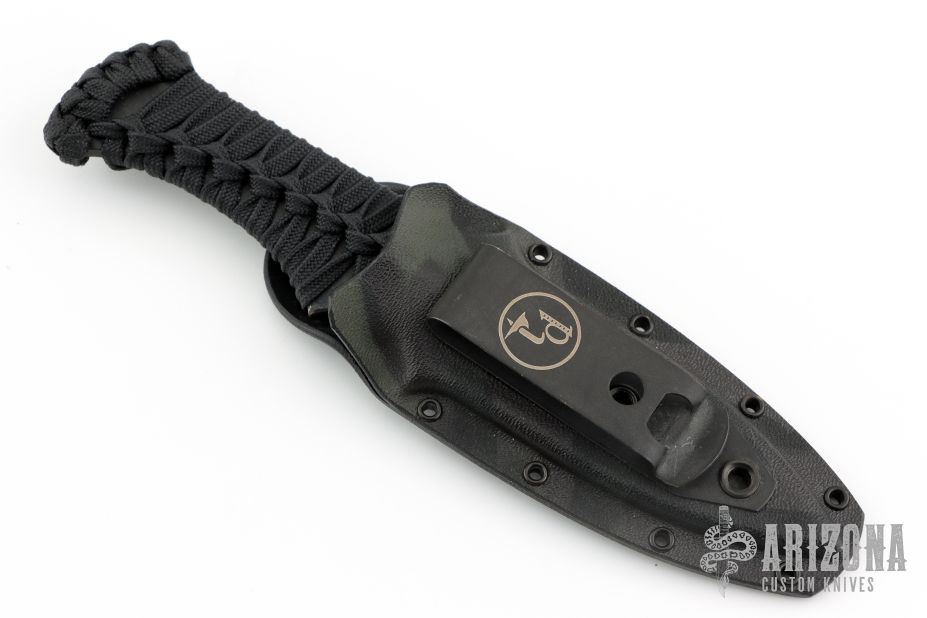 This Blood Shark by Tracker Dan features a drop point blade with .147" blade stock, and 1.09" blade depth. The handle has a black cord wrap. Comes with a 3/4 kydex sheath and the knife will fit in either direction. Has some sheath rub, otherwise Excellent condition.