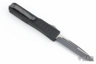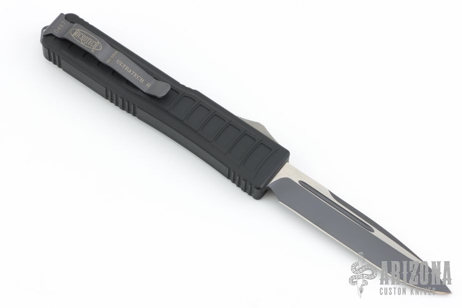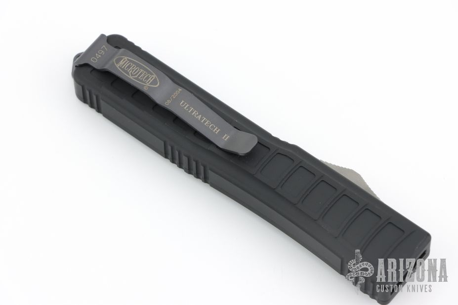 This Ultratech II by Microtech features a satin finished blade. The handle has a black aluminum frame with a "stair step" design for better grip. Stainless steel tip down clip marked 08/2004 with s/n 0497. Pretty rare piece. Excellent condition. Comes with original box and papers.